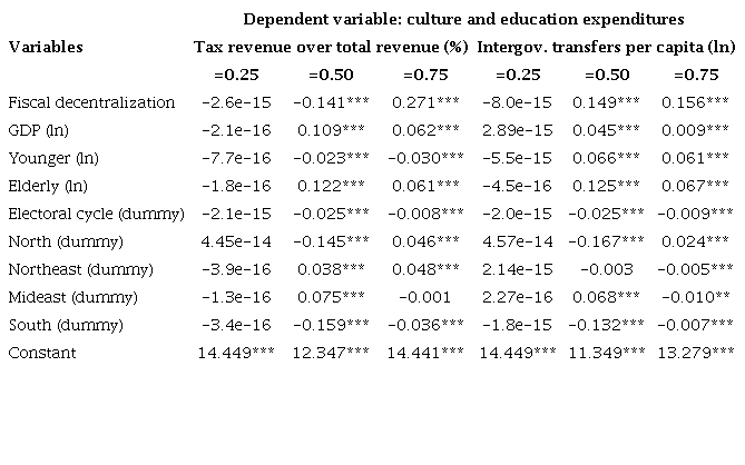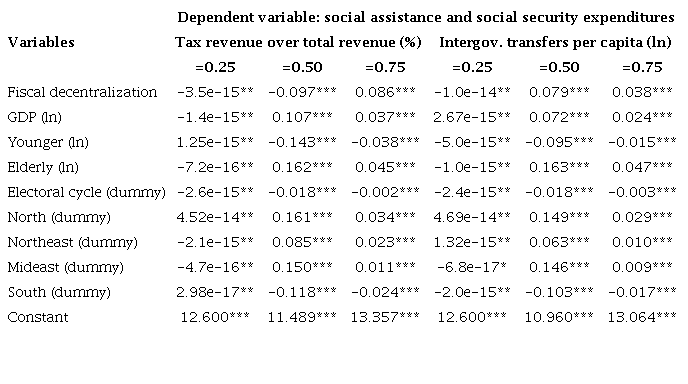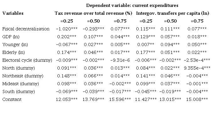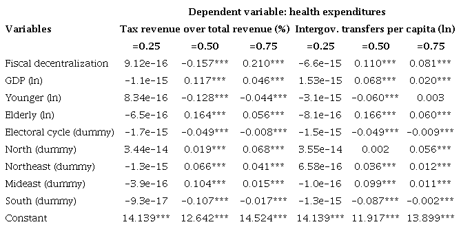 Finally, health assistance and social security expenditures showed statistically negative effects for the first quartile and the median as well as positive effects for the third quartile after estimations with tax revenue over total revenue. Regarding intergovernmental transfers per capita, the effects of fiscal decentralization were statistically negative for the first quartile and positive for the median and third quartile. Furthermore, the coefficients estimated for both fiscal decentralization variables were too small for the first quartile; in practical terms, they were irrelevant.