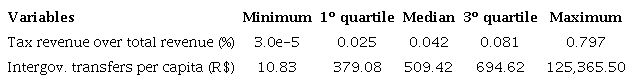 Fiscal decentralization measured by tax revenue over total revenue and intergovernmental transfers per capita demonstrated great heterogeneity in Brazilian municipalities. Table 1 describes the statistical information regarding fiscal decentralization variables. The median of tax revenue over total revenue was 0.042, while the first and third quartiles were almost half and double the median with 0.025 and 0.081, respectively. Similar features were observed for the variable intergovernmental transfers per capita, the differences among first, median and third quartiles were very clear. Hence, the great disparity of fiscal decentralization in Brazilian local governments.