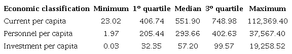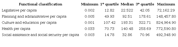 Functional classification also showed great heterogeneity. In median terms, legislative, planning and administrative expenditures are responsible for a great part of the local budgets and the many differences among municipalities are preserved. For instance, the first quartile of planning and administrative expenditures per capita is R$ 49.93 and the median is R$ 92.51, that is, 85.3% greater whereas the difference between the median and the third quartile is 93.1% (R$ 92.51 and R$ 178.61, respectively). Similar features are observed for the other variables. Thus, in terms of functional classification, there is diversity in local expenditures.