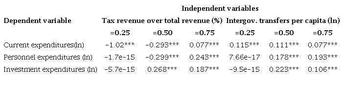 The estimated regression coefficients for local expenditures by economic classification are described in the Table 6. All coefficients estimated by the econometric model used are presented in the Appendix of this paper. For current expenditures, the first quartile and the median showed negative effects of fiscal decentralization measured by tax revenue over total revenue, however, the effect was positive for the third quartile. The expected outcome for fiscal decentralization was confirmed for smaller municipalities when analyzed by tax revenue over total revenue. In other words, the higher tax revenue of a municipality, the smaller is the local expenditure due to citizens reject to towns with high level of taxes (Oates, 1972). On other hand, when fiscal decentralization is measured by intergovernmental transfers per capita, the effects are positive due to prevalence of flypaper effect.
