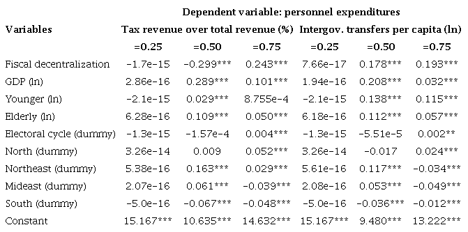 In relation to personnel expenditures, the first quartile did not present statically significant results for both fiscal decentralization measurements. However, for the median of tax revenue over total revenue, the coefficient was negative, and the effect was positive for the third quartile. The effects were also positive for median and third quartile regarding intergovernmental transfers.