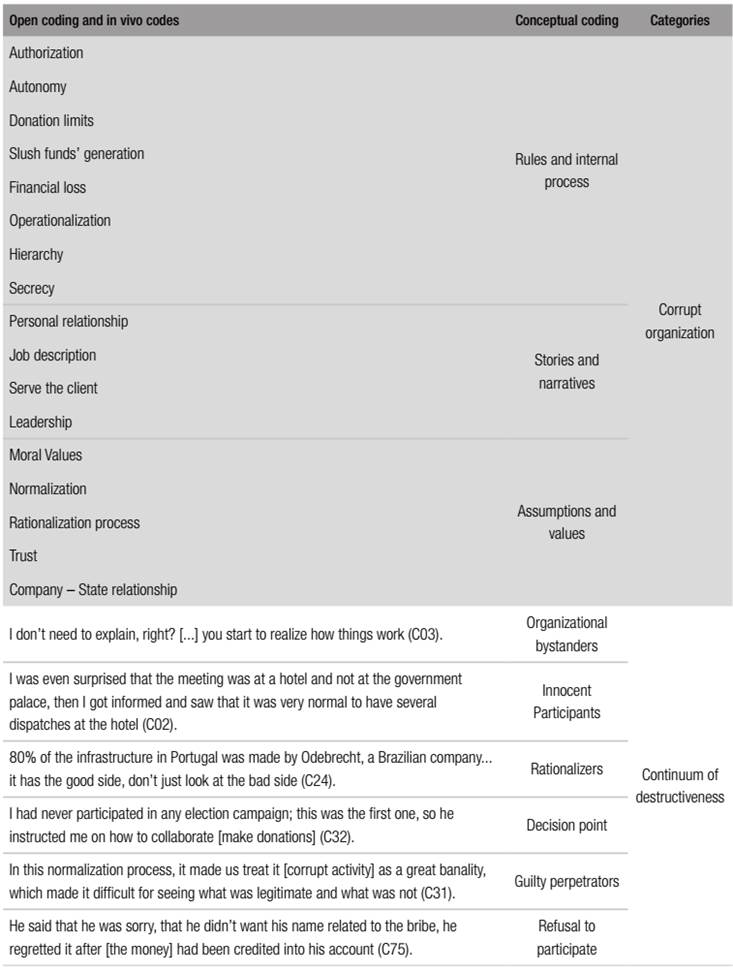 For the description of the corrupt organization category the open codes that were first created in the beginning of the analysis were grouped in concepts that described the culture, from the abstraction of the initial coding there were three conceptual codes: rules and internal process, stories and narratives, assumptions, and values. These represent the corrupt organization from their visible artifacts and processes to their underlying beliefs (Schein, 2010). After the conceptual coding, another step of constant comparisons to make links between codes and generating theoretical insight was made so to understand the relations between the rationalization mechanisms and each step of the continuum and how the corrupt culture enhances this process (Charmaz, 2000).