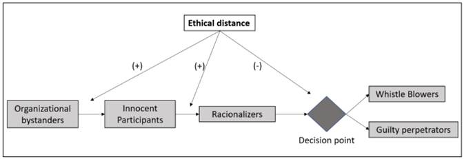 Perpetrators maintain a reduced ethical distance and visualize the consequences and moral implications of their actions. After they become aware of their wrong actions, they can decide to become whistleblowers or perpetrators (Zyglidopoulos & Fleming, 2008). At each stage of the continuum, rationalization makes it difficult to make ethical decisions. This is because the agents justify or fail to visualize the moral implications of their actions and inactions. These agents can evaluate the ethical quality of their decisions by applying different mechanisms about how the world works and how unethical activity may make changes on their identity (Messick & Bazerman, 2001). This model of ethical distance can be seen in Figure 1. It proposes that ethical distance facilitates a bystander to become an innocent participant, and an innocent participant to become a rationalizer, however it decreases to the point individuals must decide between becoming guilty perpetrators or whistleblowers (Zyglidopoulos & Fleming, 2008, p. 270).