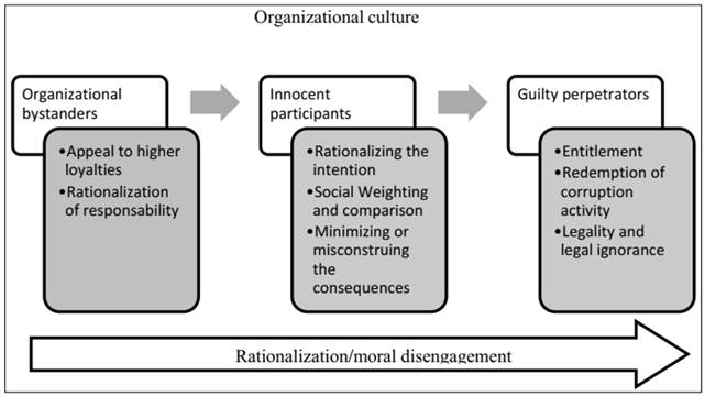The individuals in the continuum start as organizational bystanders; they rationalize by appealing to higher loyalties and rationalizing responsibility. When they participate in meetings and draw closer to the illegal side of the business, they have a high intent to rationalize. Hence, they engage in social weighting and start minimizing the consequences. At this step, their peers also play a role in strengthening their reasoning and moral disengagement. Finally, after becoming a perpetrator, they seek entitlement and redemption; they also depend on legality to rationalize their actions.