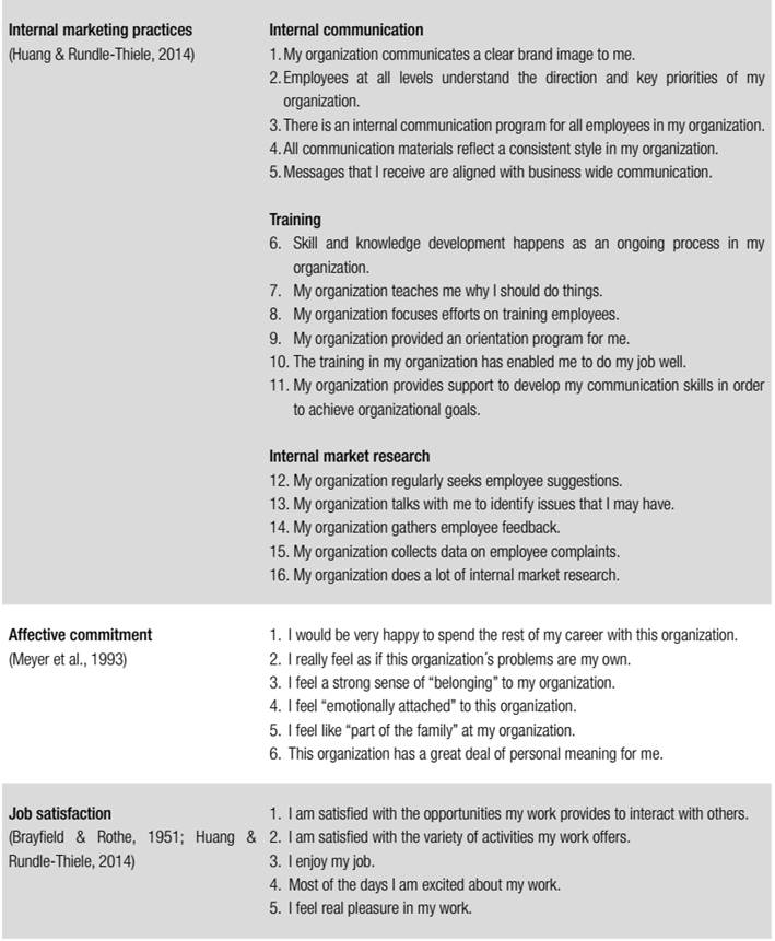 The metrics used were taken and adapted from previous research, thus not being subject to the risk of biased interpretations, guaranteeing the validity of the instrument. The metrics were translated from English to Portuguese so that they could be applied to the samples in question. The scales are measured in a 7-point Likert scale, from 1 (strongly disagree) to 7 (strongly agree) (Appendix). The internal marketing practices metric was developed by Huang and Rundle-Thiele (2014) and is subdivided into 3 dimensions, internal communication, training and internal market research. Regarding the variable affective commitment, the metric was developed by Meyer et al. (1993), and adapted to include only the items related to the affective dimension. The job satisfaction variable is based on the metric developed by Huang and Rundle-Thiele (2014) and 2 items (“Most of the days I am excited about my work “and “I feel real pleasure in my work”) from the Brayfield and Rothe (1951) scale. For the proactive behavior we use the scale adaptation developed by Bateman and Crant (1993) composed of the 6 items proposed by Claes, Beheydt, and Lemmens (2005), that is similar to the organization and individual proactivity scales developed by M. A. Griffin, Neal, and Parker (2007). Finally, regarding the variable life Satisfaction, we used the metric by Diener et al. (1985).