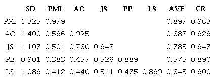 The final measurement model has a good fit (IFI = 0.949; TLI = 0.945; CFI = 0.949; RMSEA = 0.055; X2/df = 2.308). To analyze the reliability of the variables we used the Composite Reliability (CR), showing that all values are as recommended in the literature, i.e. higher than 0.7 (Hair, Black, Babin, and Anderson, 2014) and the Average Variance Extracted (AVE) show values above 0.5, so the reliability assumption is accepted (Hair et al; 2014). Discriminant validity is also confirmed because all squared correlations between variables are lower than the extracted mean variance (AVE) (Table 1).