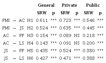 In order to test the proposed hypotheses, the structural equations modelling was used, revealing a good fit (IFI = 0.935; TLI = 0.930; CFI = 0.935; RMSEA = 0.062; X2/df = 2.660). A multi-group analysis was performed to compare the two subsamples used: the public sector and the private sector workers. Table 2 presents the final results.