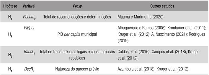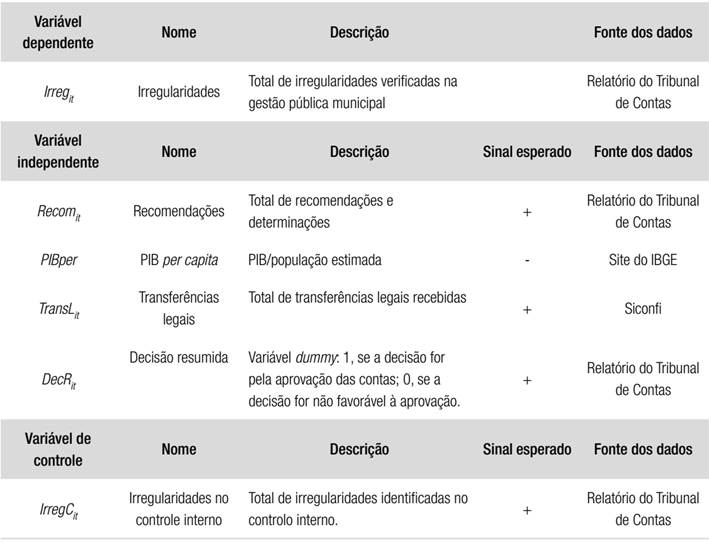 A escolha das variáveis se deu por perceber uma lacuna na literatura quando observadas as pesquisas que envolvem a análise das irregularidades apontadas em auditorias. Além disso, os estudos são limitados no número de cross-section e na quantidade de relatórios. Por exemplo, R. R. M. Ribeiro et al. (2019) analisaram as prestações de conta de 20 municípios por 5 anos, totalizando 100 relatórios, e utilizaram um procedimento técnico documental e bibliográfico. Já Azambuja et al. (2018) analisaram 706 relatórios referentes a 141 municípios, valendo-se das irregularidades para avaliar se elas interferem no julgamento das contas. Feitosa, Oliveira, Lins, e Silva (2013), R. R. M. Ribeiro et al. (2019) e Sousa e Araújo (2015), fizeram uma análise descritiva das irregularidades. Apenas Kronbauer et al. (2011) e Krüger et al. (2012) analisaram os fatores associados a irregularidades. Ainda assim, Krüger et al. (2012) analisaram 30 municípios e um total de 180 relatórios.