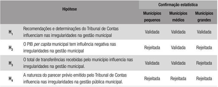 Esta pesquisa teve como objetivo analisar os fatores determinantes das irregularidades na gestão municipal. Portanto, respondendo à questão proposta, o estudo conclui que as recomendações emitidas pelos Tribunais de Contas, as irregularidades nos controles internos municipais, o PIB municipal per capita e as transferências legais e constitucionais recebidas pelos municipais são determinantes para as irregularidades na gestão pública apontadas pela auditoria municipal do Tribunal de Contas.