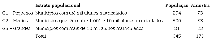 Optou-se por realizar o estudo com uma amostra estratificada, considerando o grande número de municípios do estado. De acordo com Fortin, Côté, e Filion (2009), essa amostra tem como vantagem o fato de assegurar a representação de uma parcela da população a partir de estratos relativamente homogêneos. Desse modo, foram selecionados aleatoriamente, com nível de confiança de 95%, 179 municípios (ver Tabela 1).