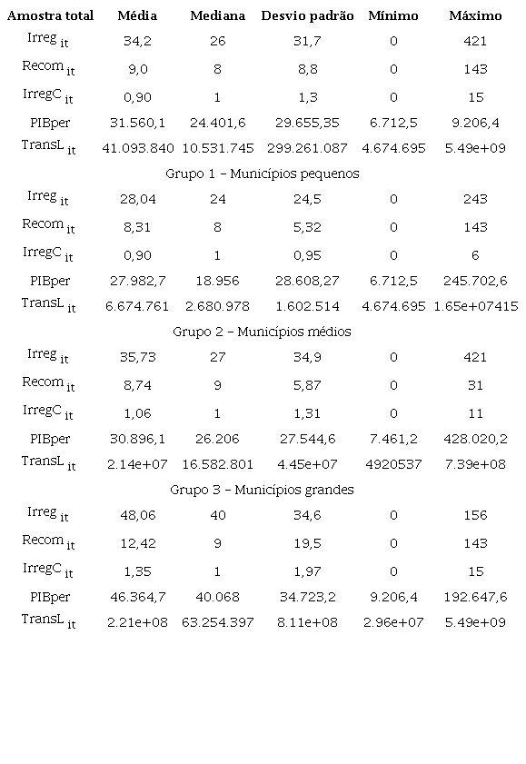 Ainda com base no que foi apresentado na tabela 2, verificamos que, na média geral, os municípios grandes têm a maior média de recomendações e determinações, de irregularidades nos controles internos, de transferências legais recebidas e do PIB per capita, enquanto os municípios pequenos têm a menor média de irregularidades.