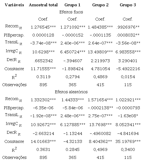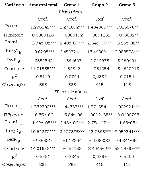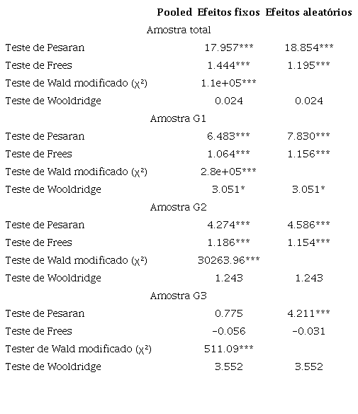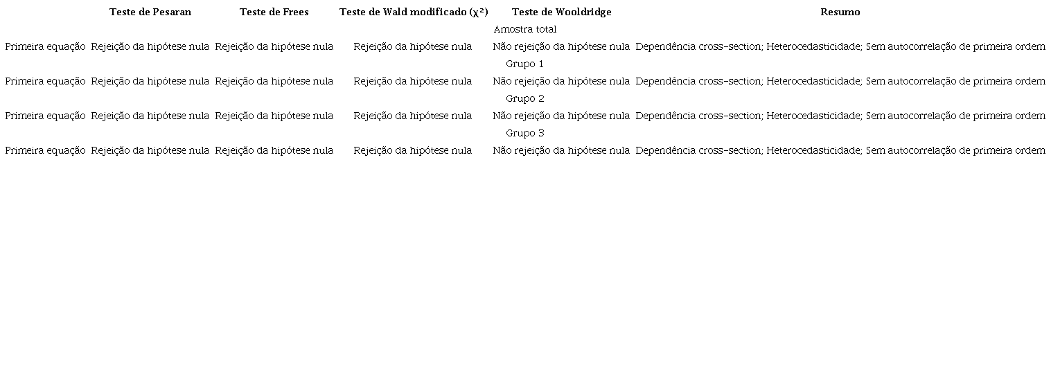 Os resultados do teste de Pesaran (2004) para os grupos 1, 2 e 3 permite rejeitar a hipótese nula de que não há correlação entre os cross-sections, ao nível de significância de 5% - há dependência cruzada. Nesse caso, permite-se considerar erro heterocedástico, ou seja, correlação entre os painéis. O teste de Frees (1995) apresenta indício de rejeição da hipótese nula para os grupos, mostrando que há correlação contemporânea entre os municípios. Confirmando a heterocedasticidade por meio do teste de Wald modificado, é possível rejeitar a hipótese nula para todos os grupos. Portanto, os dados são heterocedásticos.
