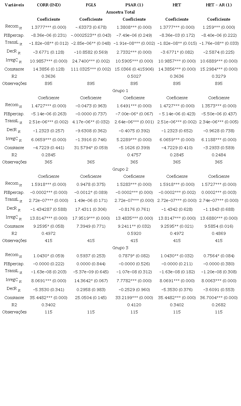 O estudo comparou os resultados dos métodos FGLS e PCSE. Em geral, o primeiro difere dos resultados do segundo, os quais costumam ser mais robustos. As premissas analisadas do PCSE são: Corr (IND), que considera não haver autocorrelação; AR (1), que considera que, dentro dos painéis, há autocorrelação de primeira ordem e que o coeficiente é comum a todos os painéis. Diferentemente do modelo anterior, o PSAR (1) considera haver autocorrelação de primeira ordem dentro dos painéis, mas o coeficiente do processo AR (1) é específico para cada painel. Por fim, o HET-AR (1) considera a heterocedasticidade em nível do painel com correlação de primeira ordem comum a todos os painéis.