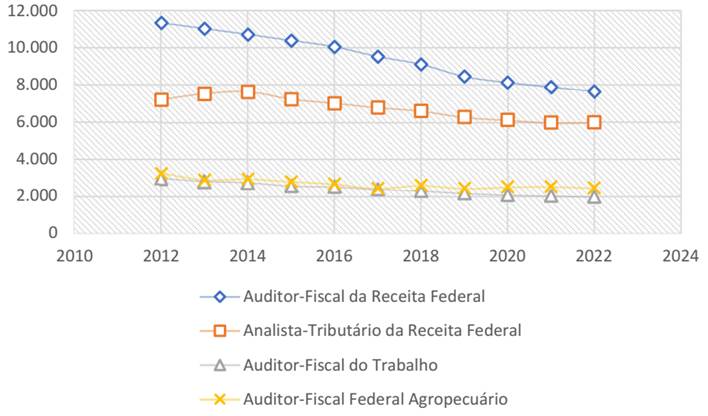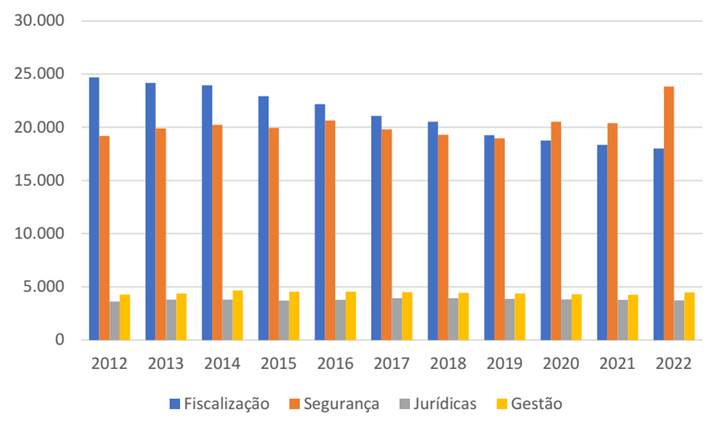 Quanto às carreiras de fiscalização, nota-se uma forte diminuição do número de servidores ao longo desse período. Em 2012, o total de servidores ativos das carreiras de auditor-fiscal da Receita Federal, analista tributário da Receita Federal, auditor-fiscal do trabalho e auditor-fiscal federal agropecuário era de 24.676. Dez anos depois, constata-se uma diminuição da ordem de 27%, com o número chegando a 17.998.
