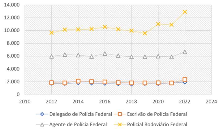 Em 2019, o número de membros na ativa da carreira de policial rodoviário federal era inferior ao de 2012 (9.584 contra 9.659). No fim de 2022, esse número já havia crescido para quase 13 mil. A carreira de escrivão da Polícia Federal apresentava cenário similar. Em 2019, o efetivo era de 1.798, contra 1.842 de 2012. As carreiras de agente e delegado da Polícia Federal realizaram movimentos menos robustos que as outras duas.