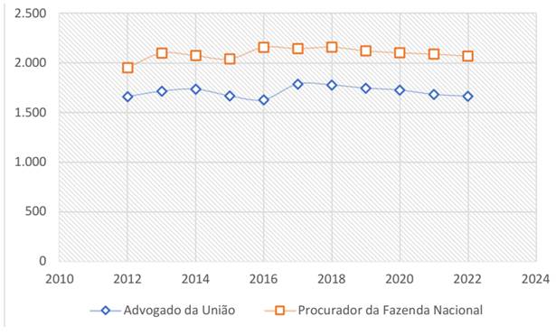 Enquanto o número de advogados da União apresentou absoluta estabilidade - de 1.659 para 1.663 -, o total de procuradores da Fazenda nacional subiu de 1.952 para 2.069, um acréscimo de 6%. As duas carreiras promoveram concursos em 2012 e 2015 (Advocacia-Geral da União, 2012, 2015; Ministério da Fazenda, 2012a, 2012b, 2015a, 2015b) e já publicaram editais para novos certames que estão sendo realizados em 2023 (Advocacia-Geral da União, 2022a, 2022b).