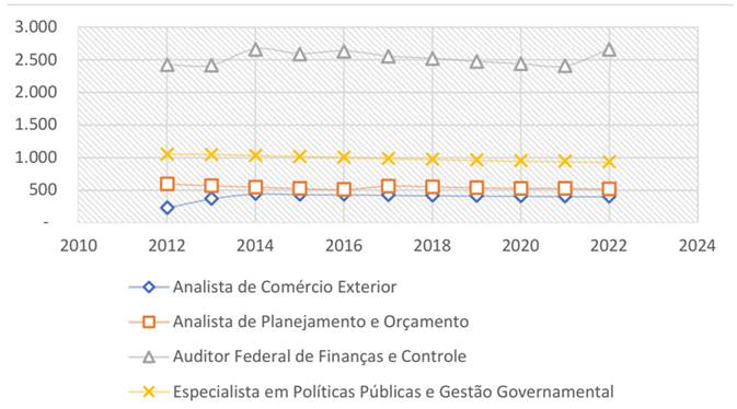 Abstract: This paper analyzes the quantitative changes in the number of servers of some State Careers of the federal executive branch between 2012 and 2022. Thus, they were divided into four groups of direct administration civil careers that carry out similar activities and are commonly classified as typical of the state: Public Security, Legal, Inspection, and Public Management. Based on surveys carried out by the Statistical Panel of Federal Government Personnel, it was concluded that, during the period, the careers of the selected Public Security group grew strongly (+24%) and surpassed the selected Inspection careers in number of employees (-27%), which were reduced in a similar proportion. Individually, the careers that grew the most were Federal Highway Police (34%) and Foreign Trade Analyst (78%). The careers of Tax Auditor of the Federal Revenue and Labour Tax Auditor were the ones that declined the most, losing almost a third of their active servants each (33% and 33%).