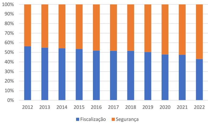 Em síntese, as análises e os levantamentos realizados indicam forte crescimento do número de servidores ativos das carreiras de segurança pública (+24%), entre 2012 e 2022, e grande diminuição do efetivo de servidores da área de fiscalização (-27%) do Poder Executivo federal no mesmo período, enquanto as carreiras jurídicas (+3%) e de gestão pública (+5%) realizaram movimentos próximos da estabilidade. O Gráfico 5 ilustra a inversão de tamanho das carreiras de fiscalização e de segurança no Poder Executivo federal. As carreiras de fiscalização selecionadas tinham mais de 5 mil servidores a mais que as de segurança pública selecionadas em 2012 e terminaram 2022 com quase 6 mil servidores a menos, o que aponta uma clara mudança de perfil do Estado.