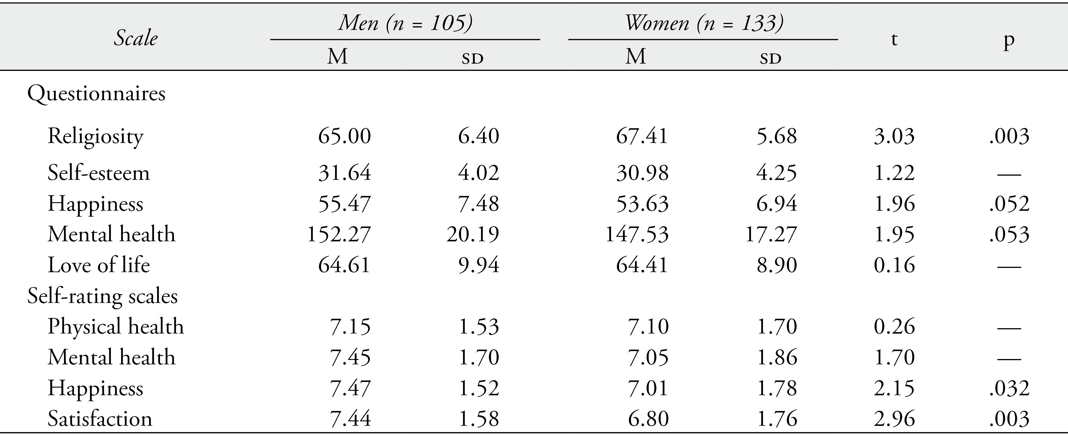 Table 2 presents the descriptive statistics and the t-values. Reference to this table indicates that men obtained significantly higher mean scores than women did for the self-rating scales of happiness and satisfaction with life. On the other hand, women obtained a significantly higher mean score than their male counterparts did for the asir.