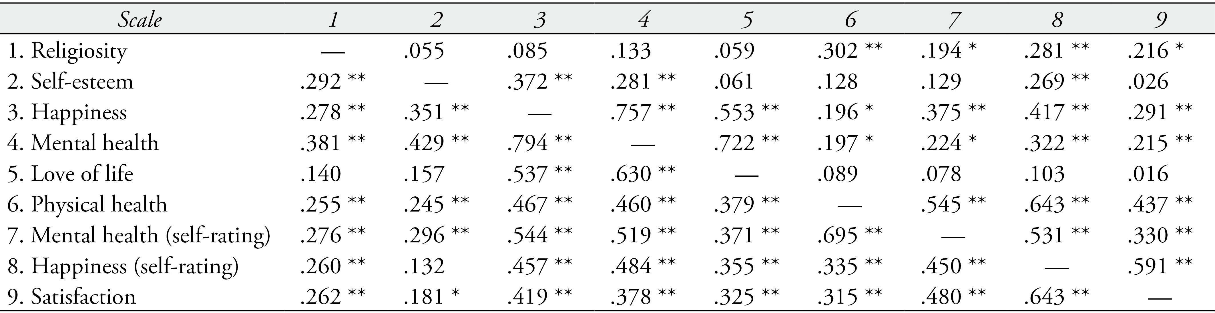 Table 3 sets out the correlation matrices separately for men and women. The main interest in the present study was the association between religiosity and other variables. Inspection of this table indicates that the correlations between religiosity and the four self-rating scales among men were statistically significant. Among women, all the correlations between religiosity and other scales were statistically significant except with the lls.