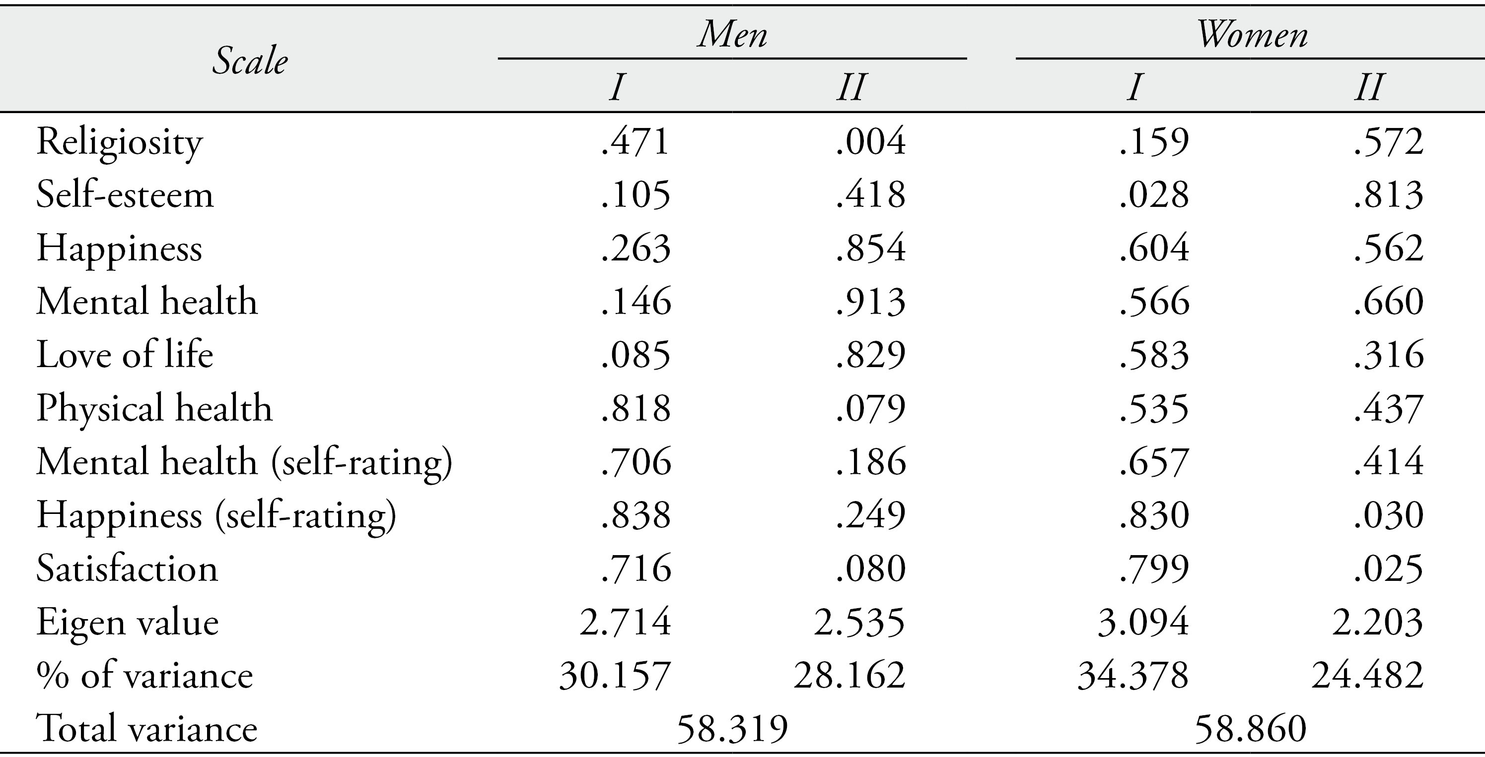 To explore the factor structure of the study scales, exploratory factor analyses were conducted for men and women separately because there were statistically significant differences between them for five of the nine scales. Table 4 presents the principal components analysis results. Two components were retained for men and for women. Both factors accounted for 58% of the common variance in men and in women. These components could be labeled: “Well-Being and Religiosity”, and “Mental Health and Happiness” in men. In women the two components could be labeled: “Well-Being and Happiness”, and “Self-Esteem, Mental Health and Religiosity”.