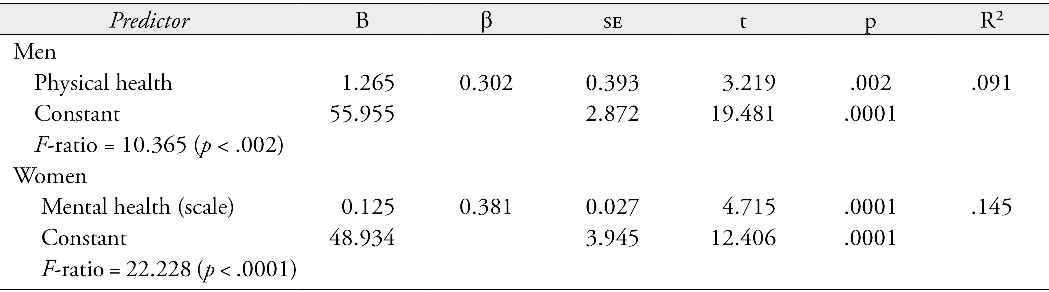 Multiple regression analysis was calculated with religiosity as the dependent variable. Table 5 reveals that the main predictors of religiosity were the self-rating scale of physical health in men and mental health in women.