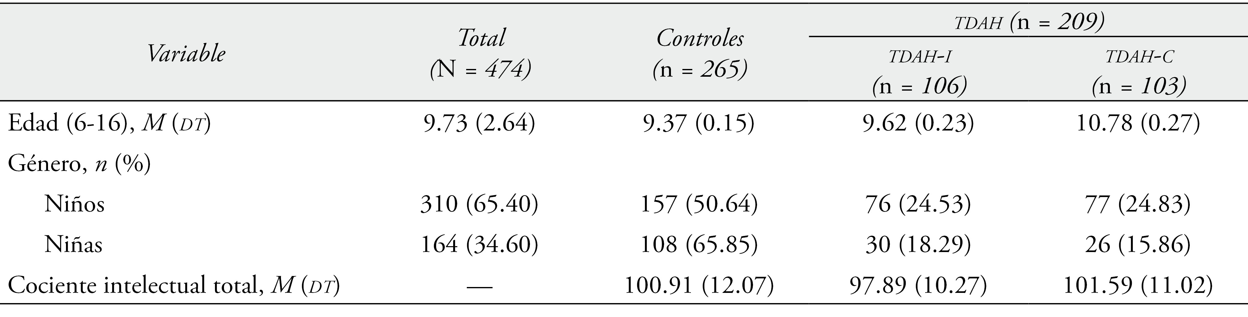 La muestra productora (ver la tabla 1) la formaron 474 niños (310 niños y 164 niñas) de entre 6 y 16 años (M = 9.73, dt = 2.64). De ellos, 209 tenían un diagnóstico de tdah (106 de tdah-i y 103 de tdah-c) mientras que 265 eran niños del grupo control.