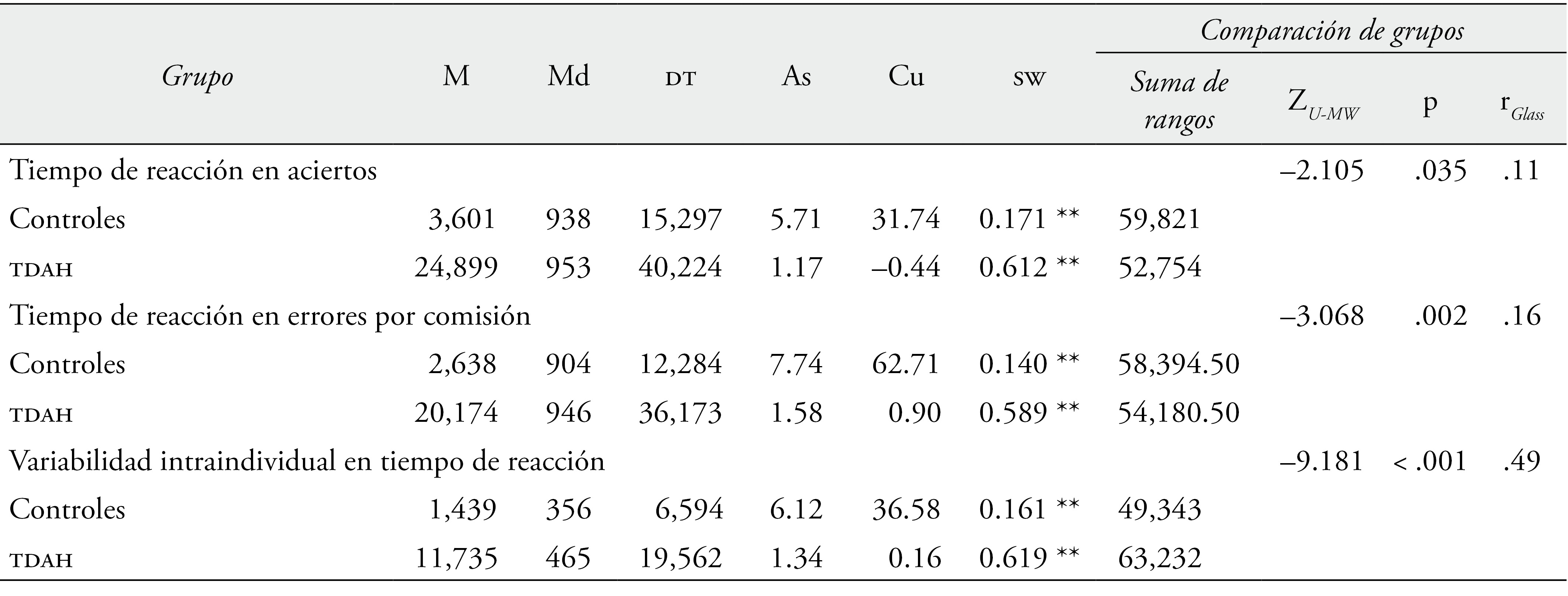 En la tabla 2 se presentan los estadísticos descriptivos de los grupos comparados, así como los resultados de la comparación entre grupos. Se observaron, en general, grandes desvíos de la normalidad estadística en las distribuciones de los puntajes; este desvío de la normalidad fue muy grande en el grupo control, reflejado en los coeficientes de asimetría y curtosis, y en la prueba estadística de normalidad (prueba de Shapiro-Wilk > .150 en el grupo control y > .55 en el grupo con tdah). También, la diferencias en la variabilidad (desviación estándar) fueron grandes entre los grupos, aproximadamente, 2.5 veces mayor en la variabilidad del grupo con tdah frente al grupo control.