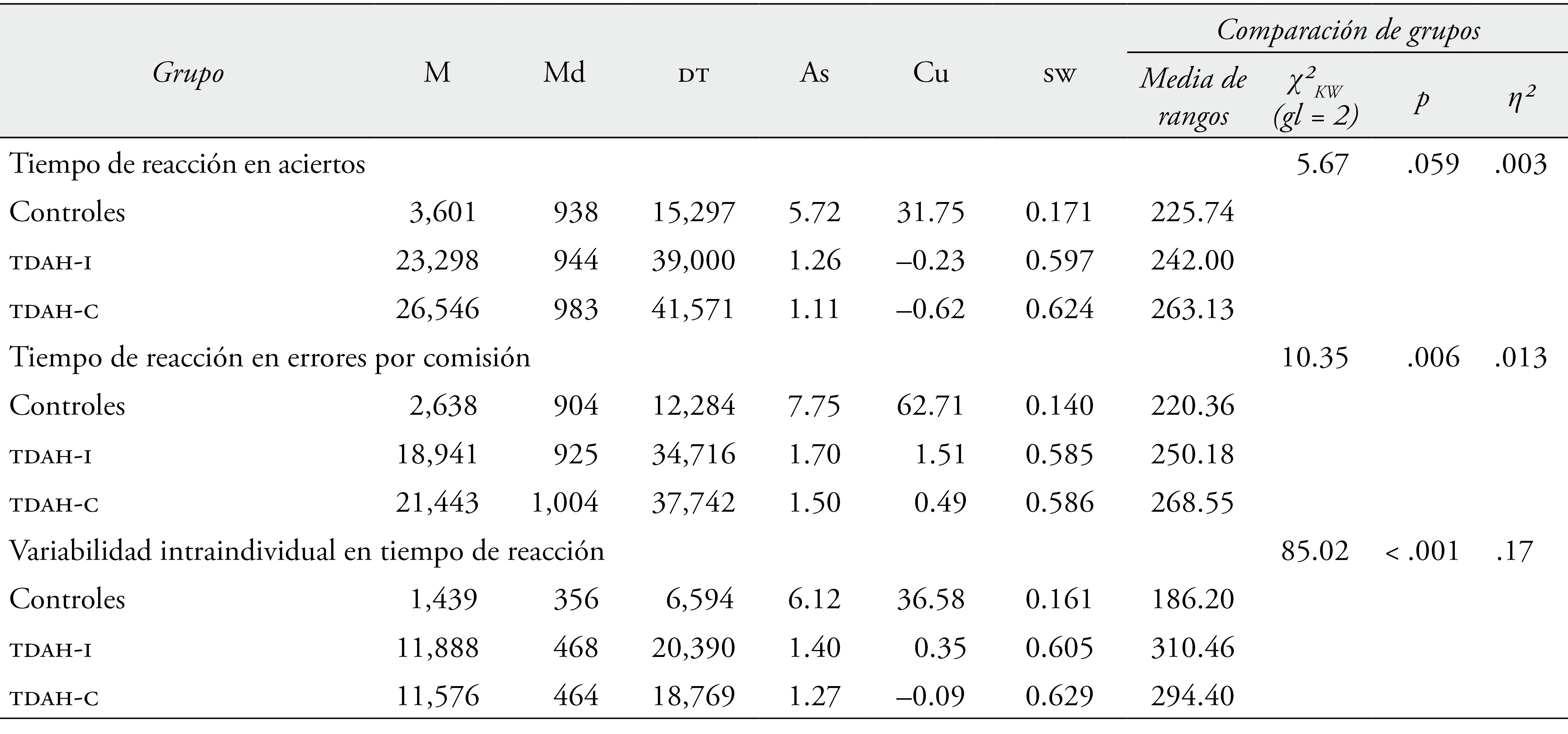 Los resultados respecto de los grupos diagnósticos se muestran en la tabla 3. Como se observa, los resultados revelaron que no existían diferencias significativas entre los tres grupos en la variable tiempo de reacción en aciertos (ji cuadrada de Kruskal y Wallis estadísticamente no significativa), pero sí en la variable tiempo de reacción en errores por comisión y vtr (χ² de Kruskal y Wallis > 10.0). De acuerdo con la magnitud de la eta cuadrada, la diferencia entre los grupos fue más grande en la vtr.