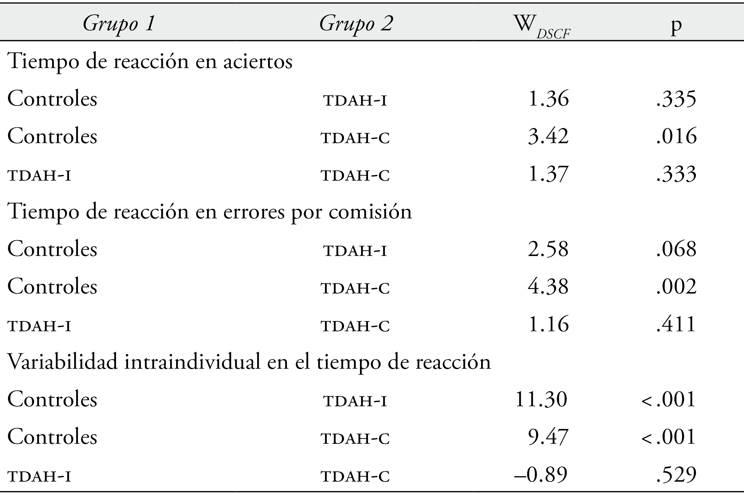 En la variable tiempo de reacción en aciertos, al llevar a cabo comparaciones post hoc (tabla 4) tras la realización de los análisis previos, se hallaron diferencias significativas entre el grupo control y aquel con tdah-c, donde estos últimos mostraron mayor rango promedio, al igual que en el caso del grupo con tdah-i. Finalmente, el grupo control fue claramente diferente frente a ambos grupos con tdah, al exhibir un menor rango promedio.