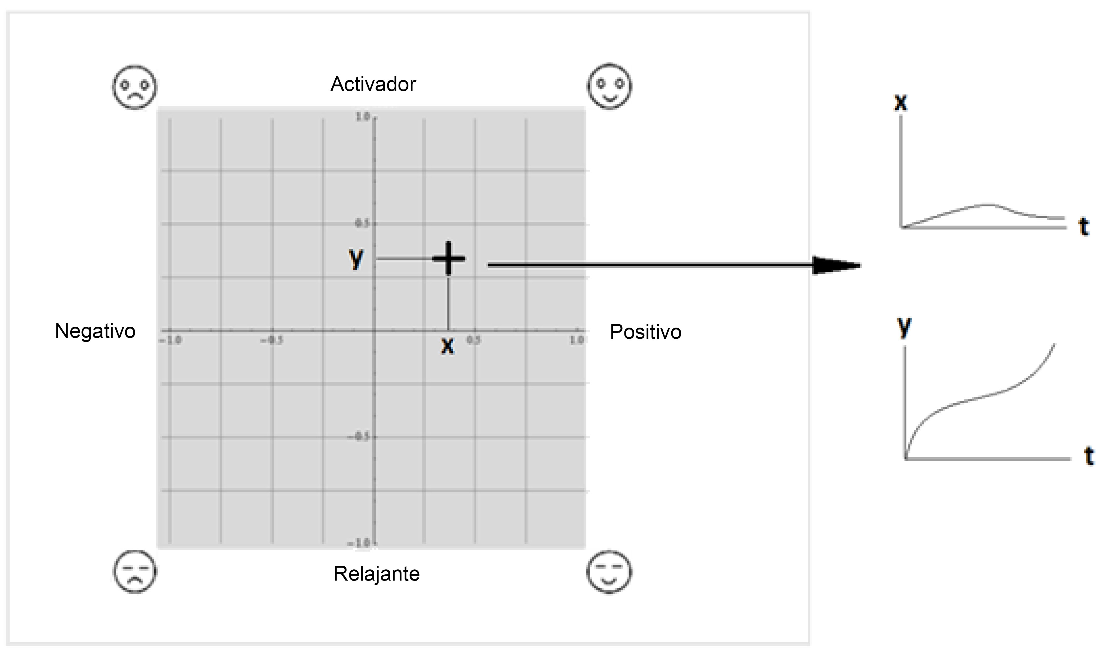 En este sentido, la forma tradicional de estudiar la relación entre diferentes dimensiones de personalidad y afecto ha consistido en correlacionar las puntuaciones del individuo en el rasgo con el valor afectivo que le otorga al estímulo una vez evaluado en su totalidad, es decir, cuando los participantes evalúan la emoción al final de la exposición al estímulo. Este proceder impide conocer el desarrollo temporal de la emoción. Es por ello que recientemente se ha planteado la necesidad de estudiar la respuesta del individuo al estímulo emocional de forma continua en el tiempo (Kuppens y Verduyn, 2017). Esta necesidad es más relevante en el caso de estímulos musicales ya que éstos se encuentran extendidos en el tiempo y, por tanto, la respuesta emocional puede ser cualitativa y cuantitativamente diferente dependiendo de la sección de la obra que esté escuchando. Este planteamiento se ha aplicado en otros trabajos de investigación con notable éxito en la predicción de la respuesta emocional del oyente (Coutinho y Cangelosi, 2011; Korhonen, Clausi y Jernigan, 2005; Saiz-Clar, Abad-Tortosa, Serrano y Reales, 2017). En estos trabajos, el registro de la respuesta emocional continua al estímulo se realiza desde el modelo teórico de Russell (1980) donde dos dimensiones, activación y valencia, permiten describir y categorizar las emociones básicas de alegría, tranquilidad/relajación, tensión y tristeza (Saiz-Clar y Reales, 2018). Así, se ha observado que el juicio del oyente sobre la activación y la valencia emocional de un estímulo musical difiere conforme se desarrolla la pieza musical, y que esta evolución temporal es muy semejante para diferentes participantes ante la misma pieza musical, especialmente en el juicio sobre la activación (Korhonen et al., 2005). El procedimiento experimental utilizado en estos trabajos presenta algunas diferencias entre estudios, pero a grandes rasgos se aproximan a la formalización realizada mediante el programa informático EMuJoy (Nagel, Kopiez, Grewe y Altenmüller, 2007), donde los oyentes indican el grado de activación y valencia emocional mediante movimientos verticales (activación) y horizontales (valencia emocional) del cursor del ratón (véase la figura 1) sobre unos ejes cartesianos. De este método de medición continua de la respuesta se puede obtener dos mediciones, la intensidad (o amplitud) de la respuesta en cada dimensión del plano (activación y valencia) y su evolución temporal. Dada la respuesta de una persona a una de las dos dimensiones de la emoción (activación o valencia emocional), se puede definir la evolución temporal de la respuesta como el continuo de movimientos del cursor registrados para ese oyente en un estímulo concreto y una dimensión particular. Este continuo formará una curva de respuesta desde el origen de coordenadas hasta el final de la exposición. Por su parte, la amplitud de la respuesta indica la intensidad del juicio emocional del oyente como la distancia vertical del cursor al centro del espacio de ejes cartesianos. De esta manera, si se separa la muestra en dos grupos (p.ej., altos en bs vs. bajos en bs) se puede o bien detectar diferencias en la función que relaciona el tiempo con la posición del ratón en su proyección al eje de abscisas (horizontal), o bien, diferencias en la amplitud de esta respuesta en su proyección al eje de ordenadas (vertical). Dado que el primero representa la valencia emocional, esta función del tiempo representa cambios temporales en la valencia emocional mientras que el segundo (ordenadas) representa la activación emocional y, por ello, cambios temporales en la intensidad de la respuesta emocional (véase la figura 1).