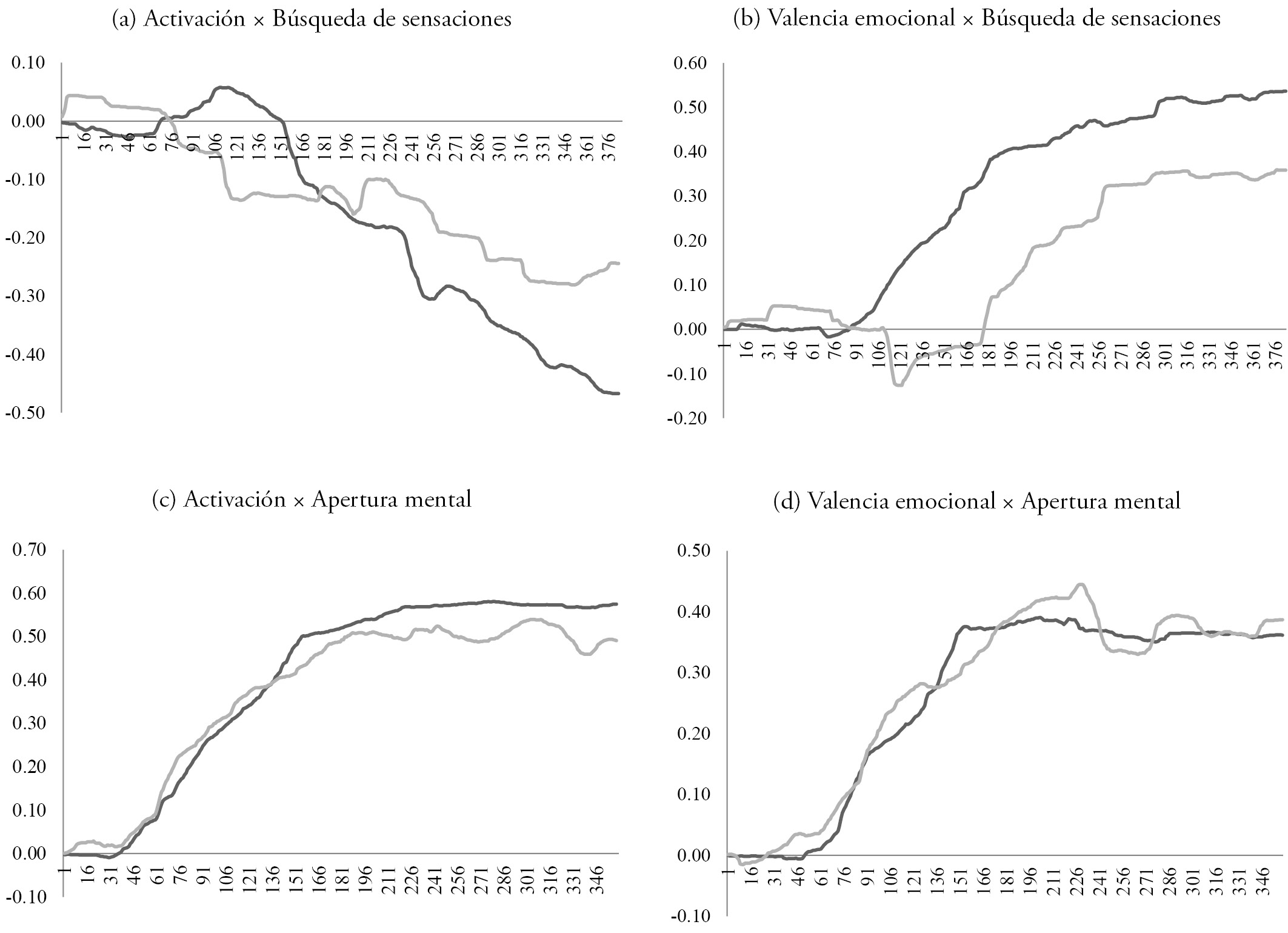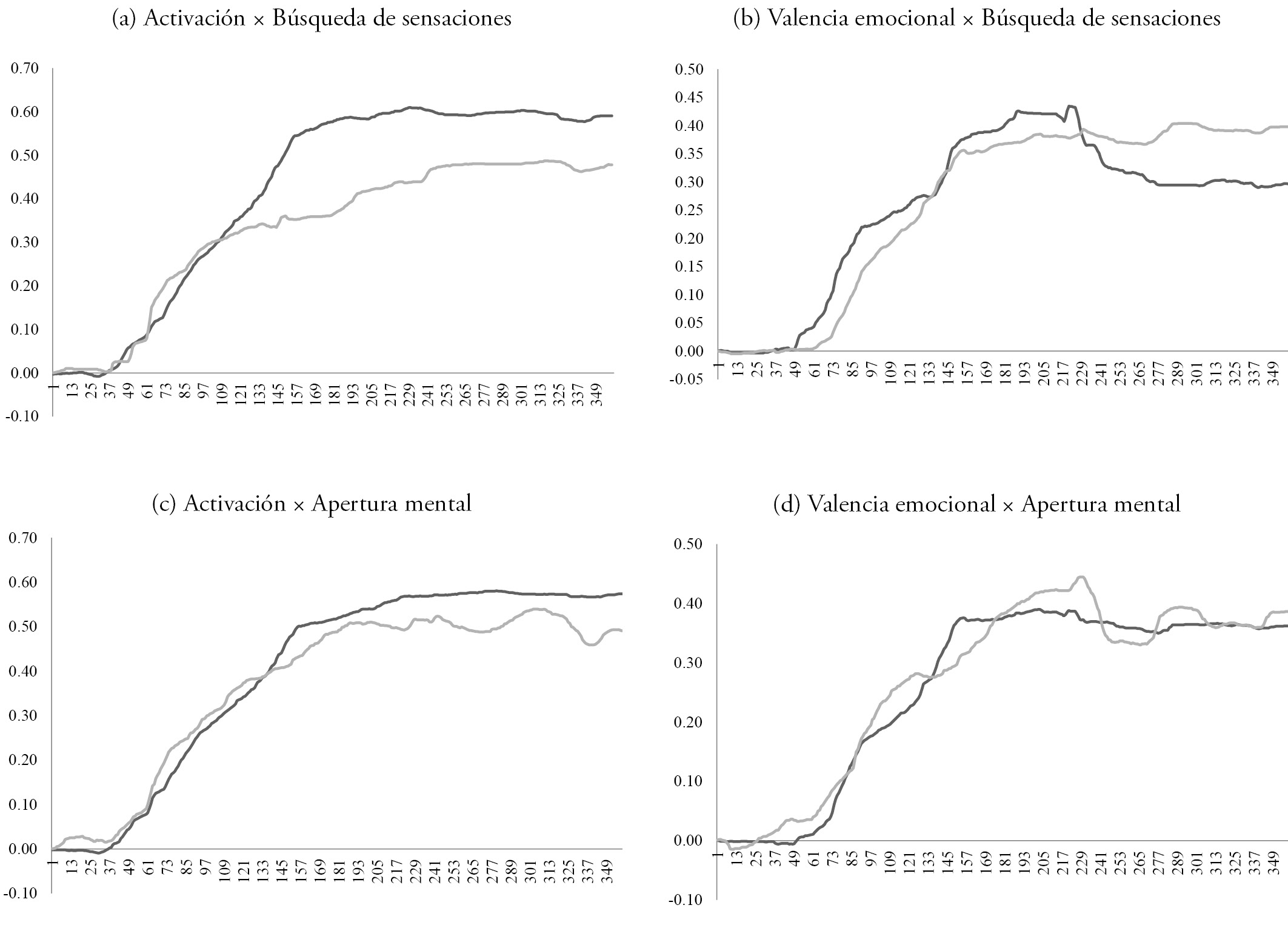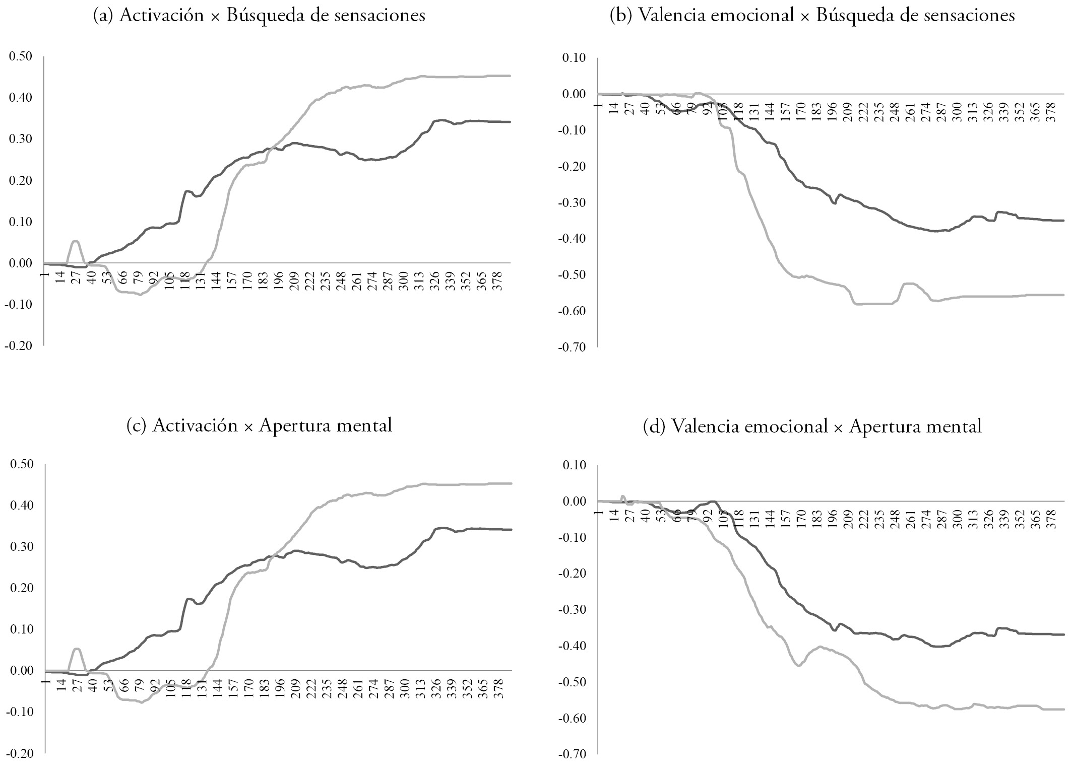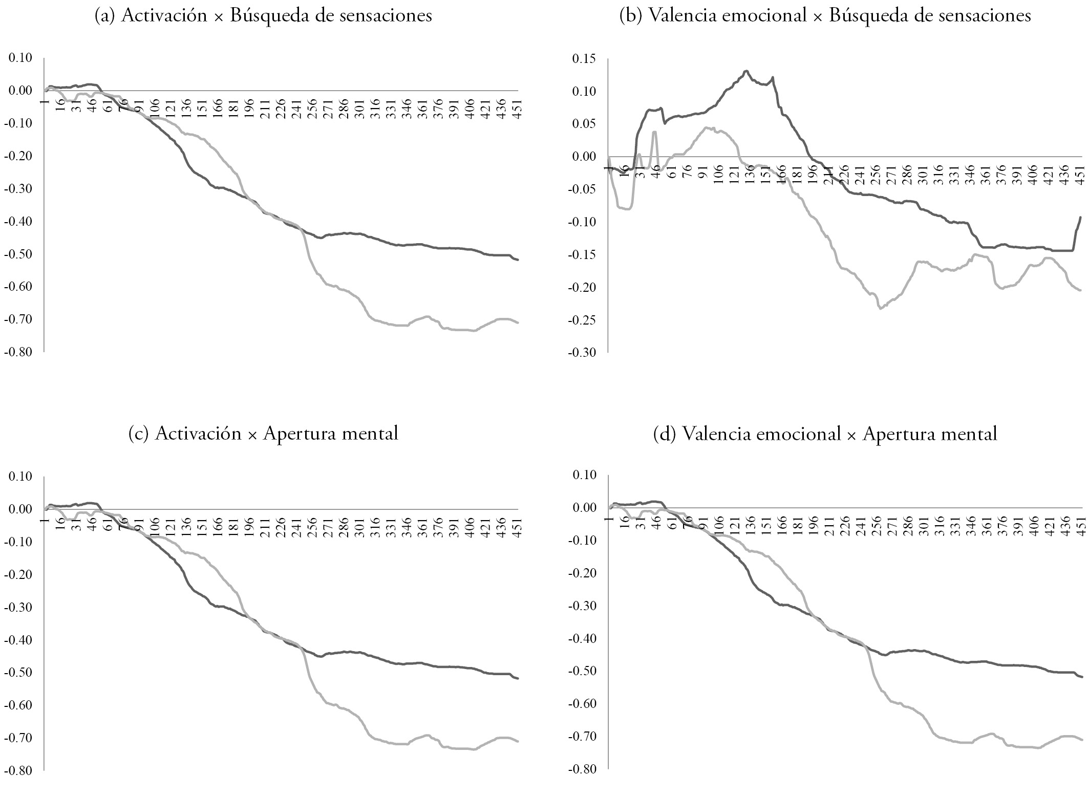 El eje x es el número de muestra temporal y el eje y, la intensidad de la respuesta de activación o valencia emocional. Línea gris = alta puntuación en el rasgo; línea negra = baja puntuación en el rasgo.