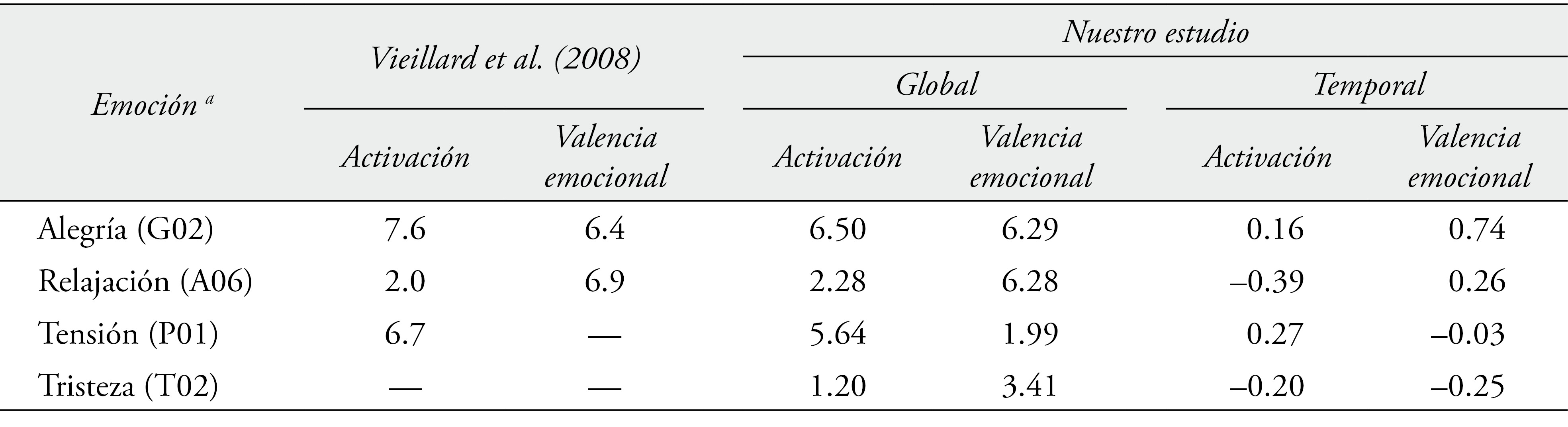Para este trabajo empleamos cuatro piezas musicales extraídas del repertorio de Vieillard et al. (2008) expuestas en la web del grupo de investigación (http://www.peretzlab.ca/publications/2008/). Del conjunto estimular presente en la misma, seleccionamos una pieza musical para cada emoción básica de alegría, relajación, tensión y tristeza, según los criterios obtenidos basándose en el modelo circunflejo de Russell (1980), respecto a activación y valencia emocional. No obstante, también comprobamos en nuestra muestra que el juicio categórico fuese similar al informado por Vieillard et al. (2008) para cada una de estas cuatro piezas musicales (véase la tabla 1).