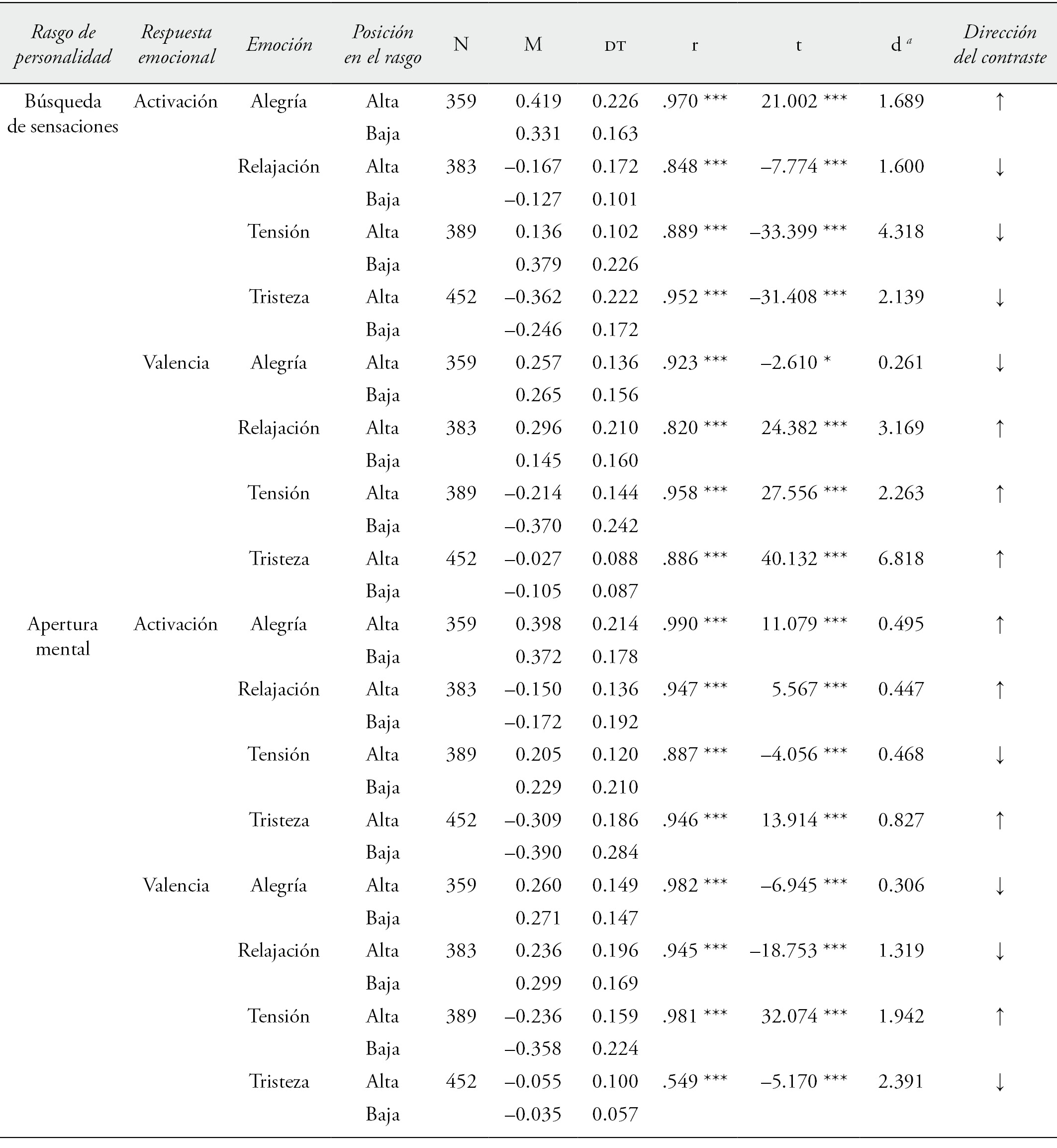 Para determinar si la distribución de la respuesta de los participantes a lo largo del tiempo de exposición al estímulo era diferente en función de su puntuación en el rasgo, estudiamos la similitud de estos pares de distribuciones correlacionando las puntuaciones entre los oyentes altos y bajos para cada rasgo de personalidad y en cada una de las piezas musicales (véase la tabla 2). Los resultados indicaron correlaciones elevadas y significativas en todos los casos, lo cual parece sugerir que el desarrollo en el tiempo de las emociones conforme se desarrolla el estímulo musical es similar entre participantes altos y bajos en bs y am. Sin embargo, a pesar de no hallar evidencias de una tendencia de respuesta diferenciada entre los oyentes en función de su puntuación en los rasgos de personalidad de bs y am, sí encontramos diferencias en la intensidad de esta respuesta. En la tabla 2 puede observarse para cada pareja comparada un valor promedio que indica la intensidad promedio de la serie temporal. Para este promedio hay un valor t de Student que contrasta, en cada pareja, si los promedios son iguales o diferentes. Después de realizar el promedio de todos los registros temporales, la intensidad de la respuesta resultó estadística y sistemáticamente diferente entre altos y bajos en los rasgos de personalidad analizados, con tamaños del efecto que oscilaban entre 0.26 y 6.82 (véase la tabla 2).
