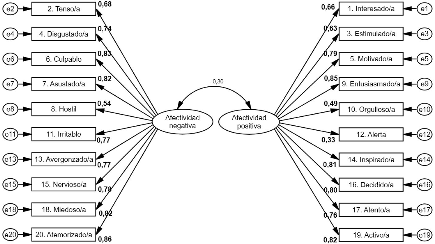 Los pesos factoriales estandarizados se pueden observar en la figura 1. Se observa que todos los pesos factoriales superaban el mínimo de 0.32 sugerido por Tabachnick y Fidell (2001), pues dicho valor equivale aproximadamente al 10 % de la varianza explicada. La carga más baja la representó el ítem 12 (“alerta”) de la escala de ap, con un valor de .33. La más alta fue el ítem 20 (“atemorizado”) de la escala de an, con un valor de .86. La covarianza entre an y ap fue de r = –.30. Los índices de modificación no sugirieron ningún cambio que variara significativamente los parámetros.