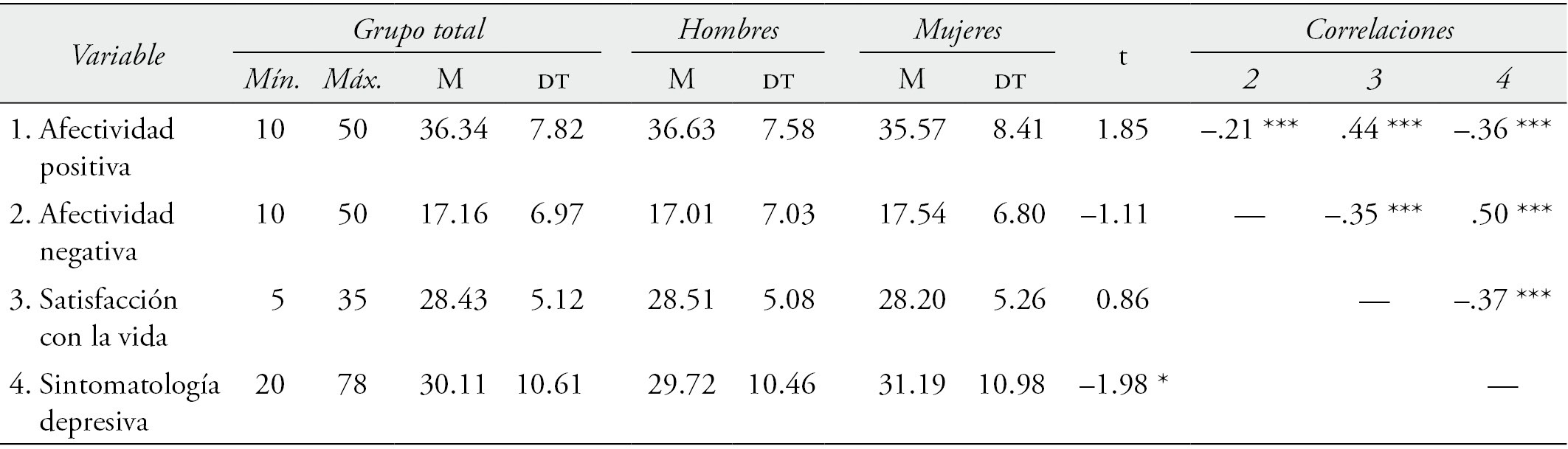 Finalmente, los estadísticos descriptivos de las escalas presentadas en este estudio se presentan en la tabla 1. También se presentan en esta tabla las comparaciones entre hombres y mujeres en las distintas escalas, donde se observa que no se encontraron diferencias significativas entre los grupos en ap, en an ni en satisfacción con la vida. Sí se observaron diferencias en la sintomatología depresiva, en donde las mujeres puntuaban más alto que los hombres.