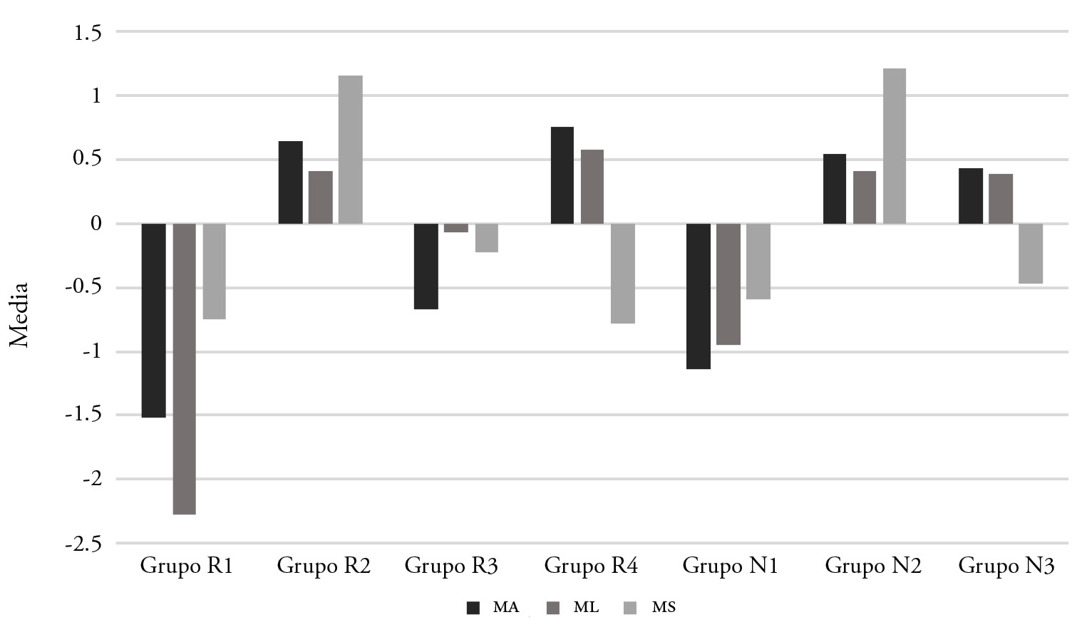 MA: metas de aprendizaje; ML: metas de logro; MS: metas de valoración social; Grupo R1: conglomerado con situación de riesgo 1; Grupo R2: conglomerado con situación de riesgo 2; Grupo R3: conglomerado con situación de riesgo 3; Grupo R4: conglomerado con situación de riesgo 4; Grupo N1: conglomerado sin situación de riesgo 1; Grupo N2: conglomerado sin situación de riesgo 2; Grupo N3: conglomerado sin situación de riesgo 3.