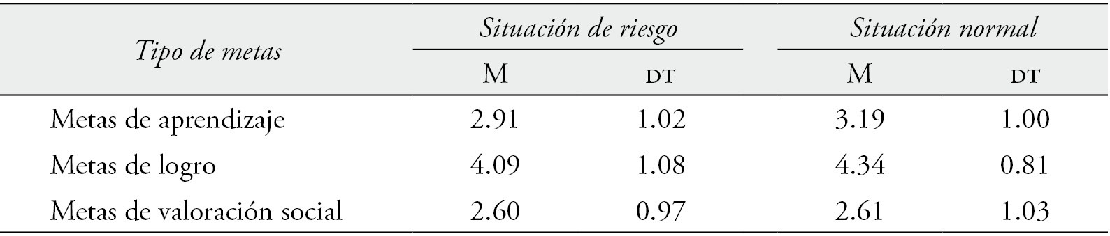 El manova mostró que la situación de riesgo tenía una influencia significativa sobre las metas académicas, F (1, 813) = 15.78, p = .001, η² = .939. Los resultados de los anova para cada una de las metas mostraron que las diferencias significativas entre los grupos se producían en las metas de aprendizaje, F (1, 813) = 10.10, p = .002, η² = .071, y en las metas de logro, F (1, 813) = 11.31, p = .001, η² = .102. Fueron los estudiantes en situación de riesgo los que obtuvieron puntuaciones más bajas en estas dos metas. No se encontraron diferencias significativas entre los grupos en las metas de valoración social, F (1, 813) = 0.02, p = .875, η² = .001 (ver la tabla 1).
