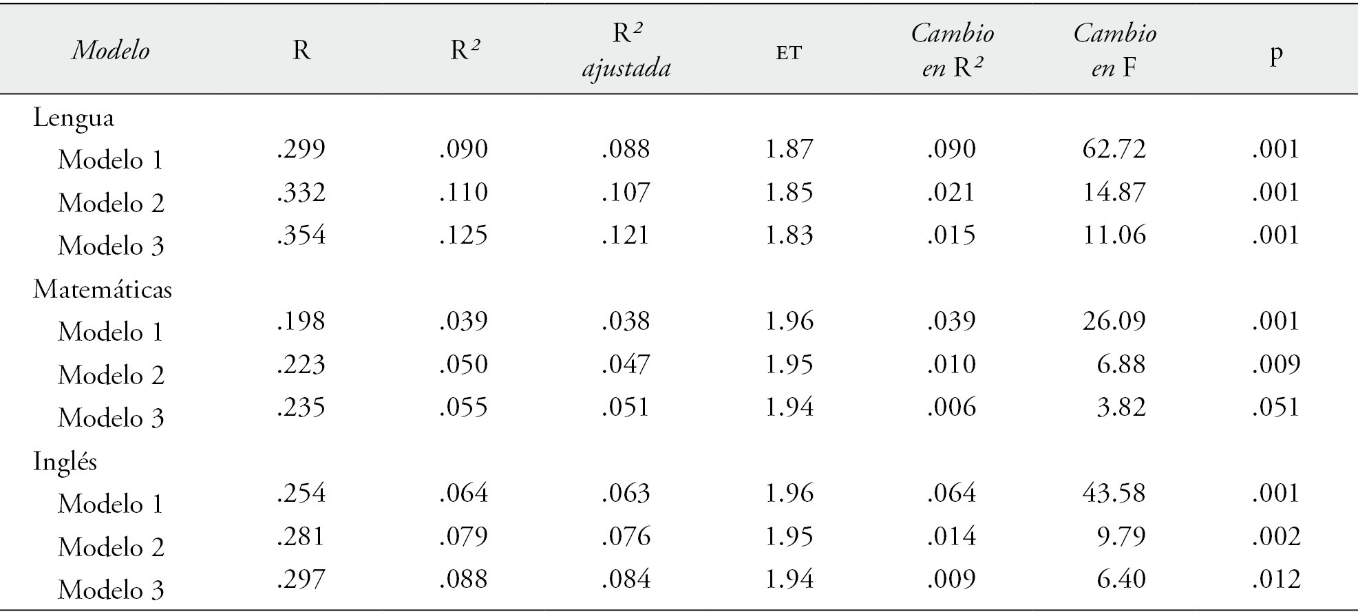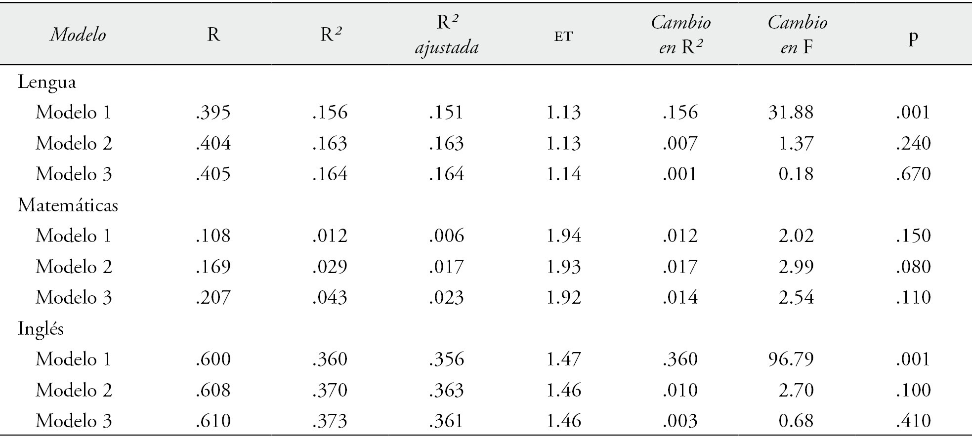 Los resultados indicaron que para los estudiantes en situación de riesgo las metas académicas tenían capacidad predictiva sobre el rendimiento en las asignaturas de lengua e inglés, pero no en matemáticas. En la asignatura de lengua, el modelo con significación estadística fue el que incluyó únicamente las metas de aprendizaje (β = 0.395, t = 5.64, p = .001), el cual predijo un 15.10 % del rendimiento académico. En cambio, para la asignatura de inglés el modelo estadísticamente significativo se apoyó en las metas de logro (β = 0.600, t = 9.83, p = .001) con una predicción elevada de la varianza del rendimiento académico, 35.60 %.