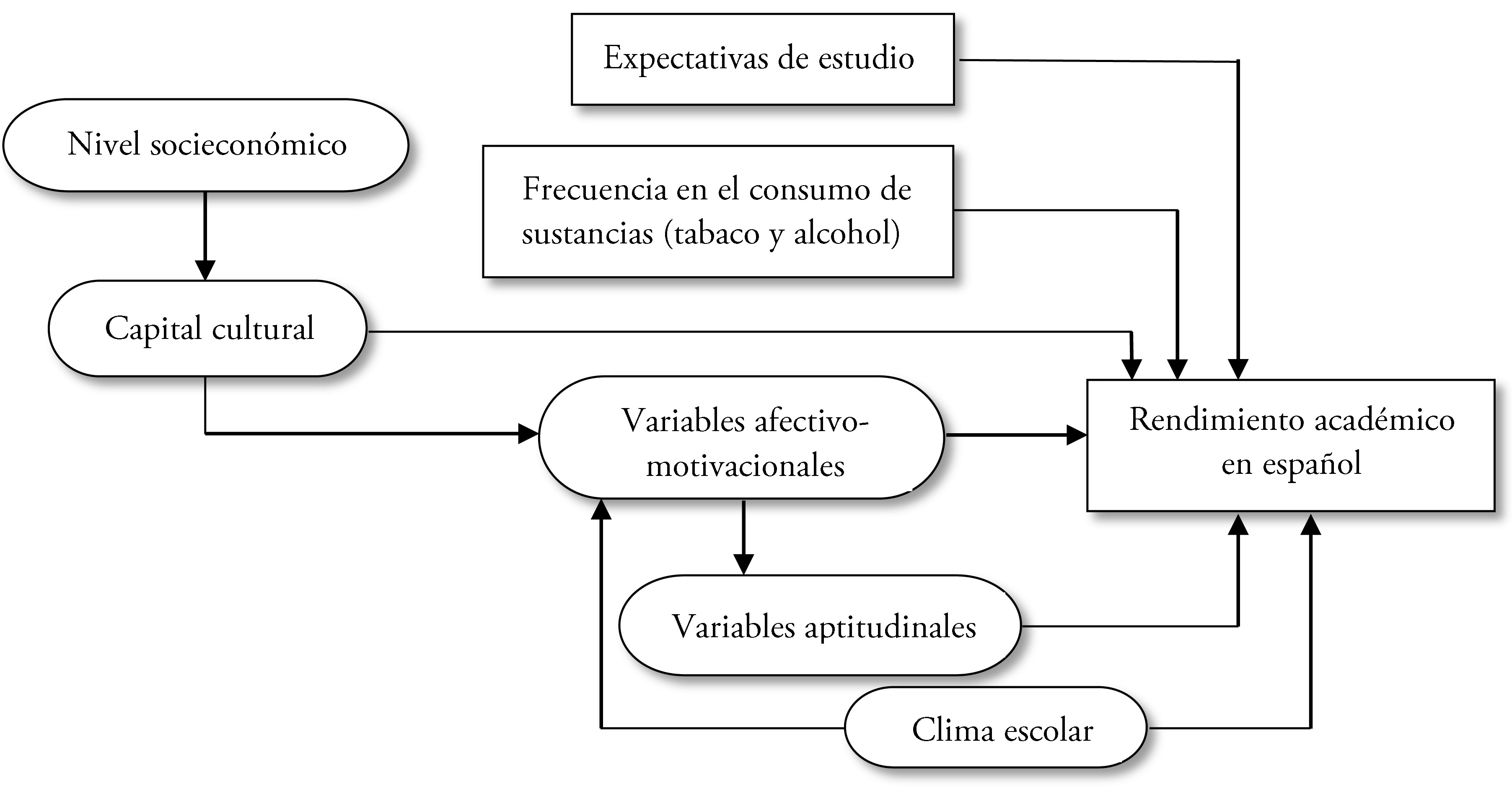 En síntesis, en el presente modelo hipotético las relaciones entre las variables se sustentan tanto en las aproximaciones conceptuales como en los estudios empíricos hasta ahora referidos, por ello seis de las siete variables ejercen una influencia directa sobre el rendimiento académico. Las variables del ámbito personal tienen una relevancia central, así, tanto el capital cultural como clima escolar ejercen influencia sobre las variables afectivo-motivacionales, mientras que el nivel socioeconómico incide directamente sobre el capital cultural.