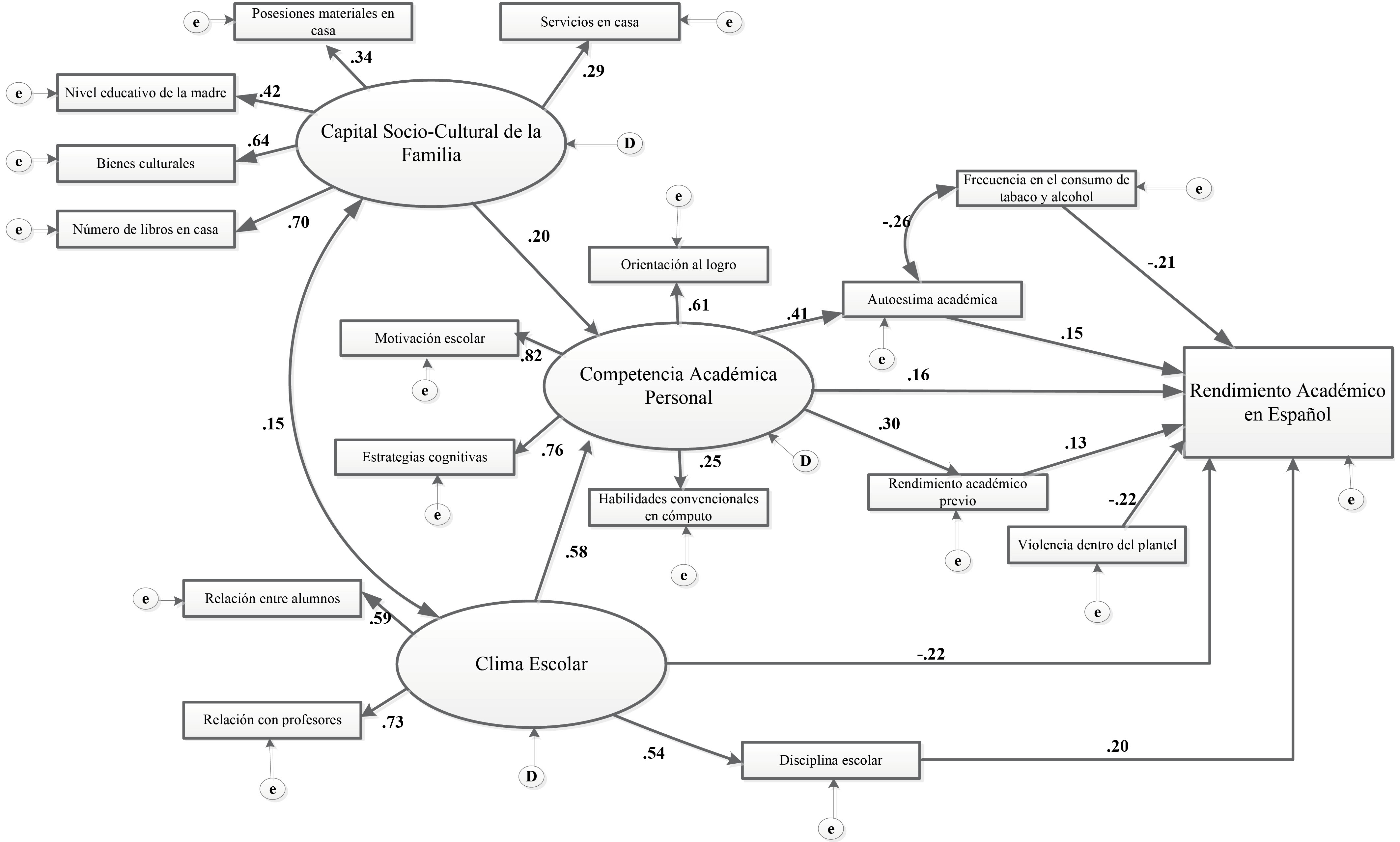 También se registraron covariaciones entre las variables latentes clima escolar y capital sociocultural (β = 0.15, p < .005), las cuales a su vez ejercen un efecto directo sobre la competencia académica personal (β = 0.58, p < .005 y β = 0.20, p < .005, respectivamente). En este mismo sentido, la autoestima académica y la frecuencia de consumo de tabaco y alcohol covariaron en forma negativa (β = –0.26, p < .005). En lo correspondiente a los coeficientes de regresión estandarizados de los indicadores para cada una de las variables latentes (competencia académica personal, clima escolar, capital sociocultural de la familia), éstas oscilaron entre 0.25 y 0.82. El modelo explicó 23 % de la varianza asociada al rendimiento académico en español.