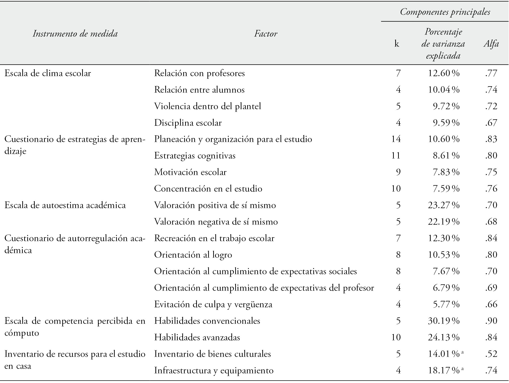 Conviene señalar que los instrumentos de medición utilizados para los fines de este estudio fueron los considerados en la Estrategia Evaluativa Integral 2010: Factores asociados al aprendizaje, instrumentada por la Unidad de Evaluación Educativa. Los bajos porcentajes de varianza explicada se asocian a que los instrumentos se desarrollaron ad hoc para el desarrollo de la estrategia evaluativa en cuestión.