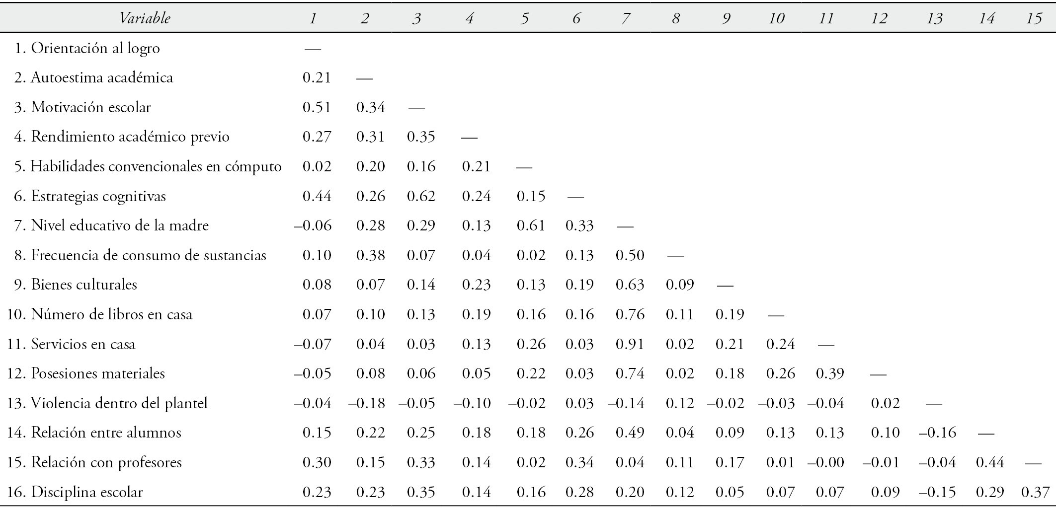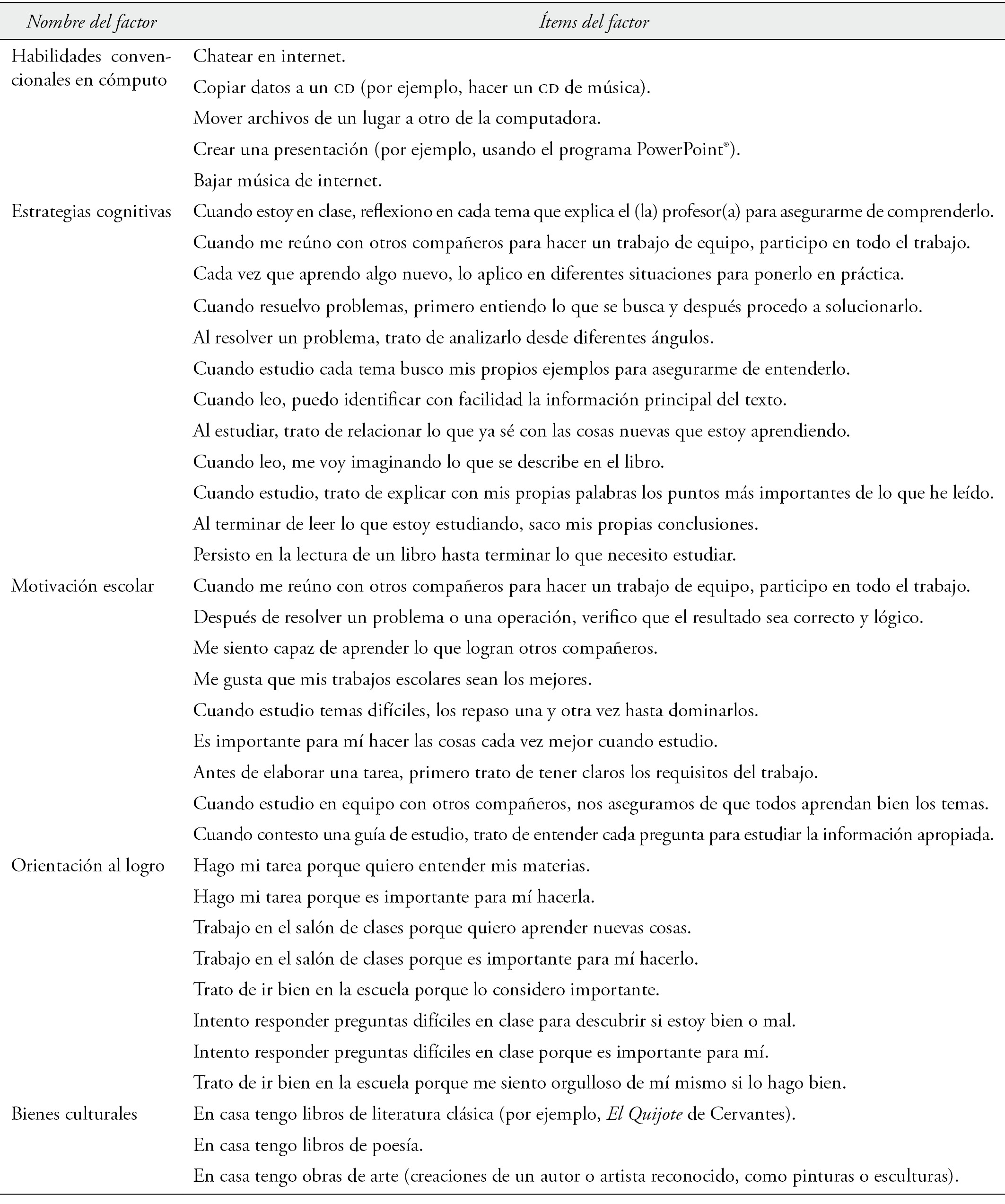 Cabe referir que las propiedades psicométricas de los factores de las escalas, cuestionarios e inventarios referidos se exponen en la tabla 1. Es preciso mencionar que el bajo porcentaje de varianza explicada en algunos instrumentos, como por ejemplo, en el Inventario de posesiones en casa, deja notar limitaciones en el plano psicométrico. Para fines de este estudio se emplearon íntegramente los siguientes instrumentos: Inventario de posesiones en casa, Escala de clima escolar, Escala de autoestima académica y Escala de consumo de sustancias en la escuela (tabaco y alcohol). A su vez se empleó el factor de orientación al logro, motivación escolar, estrategias cognitivas, habilidades convencionales en cómputo y bienes culturales (en el apéndice se presentan los ítems que conforman cada factor); también se emplearon las variables rendimiento académico previo, nivel educativo de la madre, número de libros en casa y expectativas de estudio.