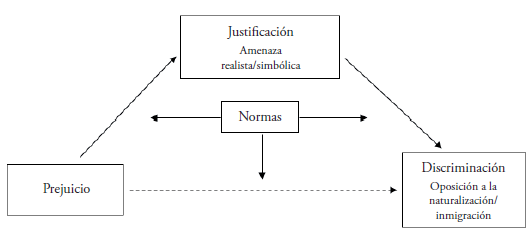 La hipótesis general derivada del mdj, y que será so- metida a prueba, es que la percepción de amenaza realista y simbólica tiene la función de legitimar la discriminación contra inmigrantes. En este sentido, se espera que esas percepciones de amenaza medien la relación entre el prejuicio y la oposición a la inmigración y a la naturalización de inmigrantes. El modelo prevé diferentes procesos mediadores según el tipo de oposición a los inmigrantes. De hecho, en el estudio original realizado por Pereira et al. (2010), la relación entre el prejuicio y la oposición a la inmigración fue más fuertemente mediada por la amenaza realista, mientras que la oposición a la naturalización se medió sobre todo por la amenaza simbólica.
