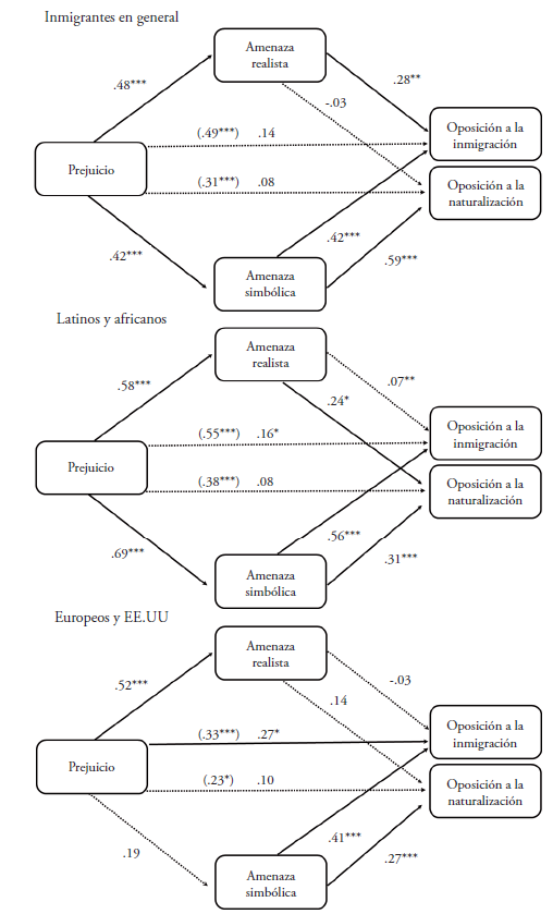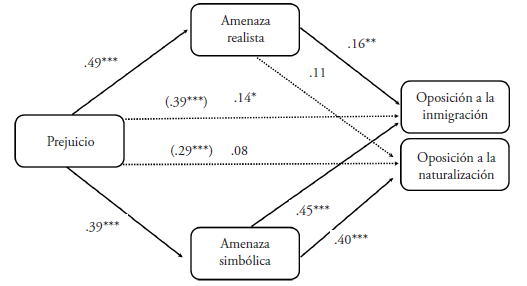 Como se preveía, el análisis de las mediaciones indicó que la relación entre el prejuicio y la oposición a la inmigración fue mediada tanto por la amenaza realista (efecto mediado = 0.06, ic 95 % [0.01, 0.11]) como por la amenaza simbólica (efecto mediado = 0.18, ic 95 % [0.12, 0.24]), siendo la mediación por medio de la amenaza simbólica más fuerte que por la amenaza realista, pues los intervalos de confianza de esos efectos mediados no se superponían. Un fenómeno diferente ocurrió en la relación entre el prejuicio y la oposición a la naturalización, pues esa relación fue mediada por la amenaza simbólica (efecto mediado = 0.16, ic 95 % [0.10, 0.22]), pero no por la amenaza realista (efecto mediado = 0.06, ic 95 % [–0.01, 0.12]).