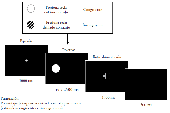 Tarea de conflicto espacial (Gerardi-Caulton, 2000). Es una tarea computarizada que evalúa la flexibilidad cognitiva mediante la inducción de conflicto y la alternancia entre instrucciones. Los niños tienen dos botones de respuesta, uno ubicado en la izquierda y otro en la derecha. En la pantalla aparece un círculo blanco o rayado al lado izquierdo o derecho. El círculo blanco corresponde a los ensayos congruentes, el niño debe presionar el botón del mismo lado en el que aparece el círculo. El círculo rayado corresponde a los ensayos incongruentes, el niño debe presionar el botón del lado contrario al que aparece el círculo. Esta incompatibilidad espacial induce conflicto y retrasa el tiempo de respuesta. La prueba incluye un bloque de ensayos congruentes, uno de ensayos incongruentes y dos bloques mixtos con ensayos congruentes e incongruentes que requieren la alternancia de instrucciones. Los estímulos se presentaron de manera contrabalanceada en cada bloque (véase la figura 1). Como indicador de flexibilidad cognitiva se consideró la media del porcentaje de aciertos de los bloques mixtos.