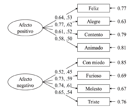 En primer lugar, este estudio ha replicado la estructura de dos factores ortogonales de la versión original de la panas (Watson et al., 1988) en una muestra de niños mexicanos. Estos resultados son consistentes con estudios pre- vios (Ebesutani et al., 2012; Galinha et al., 2013; Laurent et al., 1999; Sanmartín et al., 2018). Si bien otros estudios han sugerido una estructura de tres factores (Merz et al., 2013; Ortuño-Sierra et al., 2015), en la que el an cuenta con dos factores, uno de ellos relacionado con la molestia o el enfado y el otro con el temor o el miedo, en la presente versión de la escala, al ser una versión reducida con cuatro indicadores de an, no era posible la obtención de dos factores de an al contar con un solo indicador para el miedo.
