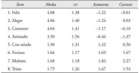 En la tabla 1 se presentan los estadísticos descriptivos de los ítems de la panas-C8-I. La media de ap para las niñas fue de 15.71 (DT = 4.62) y para los niños varones de 15.64 (DT = 4.06). La media de an para las niñas fue de 6.28 (DT = 3.34), mientras que para los niños fue de 7.65 (DT = 3.96).