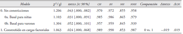En la tabla 2 se presentan los resultados del análisis de invariancia por género. Todos los modelos evaluados presentaron buenos índices de ajuste (χ² / gl < 1.40, rmsea < .06, cfi > .95, ifi > 0.95; nnfi ≥ 0.93) a excepción de un indicador (nfi > .84). El modelo 0 (sin constricciones) evaluó si la configuración de la panas-C8-I (número de factores e ítems por factor) era aceptable para niñas y niños varones; el buen ajuste del modelo demostró la invariancia de configuración de la escala. El modelo 1 (constreñido en las cargas factoriales) analizó si las cargas factoriales de los ítems fueron iguales entre los grupos. Se encontraron diferencias entre el modelo 0 y el modelo 1 (Δcfi > .01), lo que indica que la respuesta de niñas y niños a los diferentes indicadores varía.