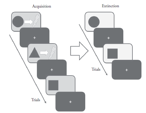 Acquisition. A fear conditioning paradigm adapted from Dibbets, Havermans, and Arntz (2008) was used. During the acquisition phase, each of three stimuli (a black square, a triangle, and a circle) were presented individually 4 times for 8 s in random order with the restriction that the shock should not occur more than two consecutive times. Each presentation of X and Y were followed imme diately by the application of the us in the forearm. A third stimulus (Z–) was also presented, after which no shock was applied. The inter-trial interval (iti) varied randomly be- tween 4 and 24 s (average = 14 s).